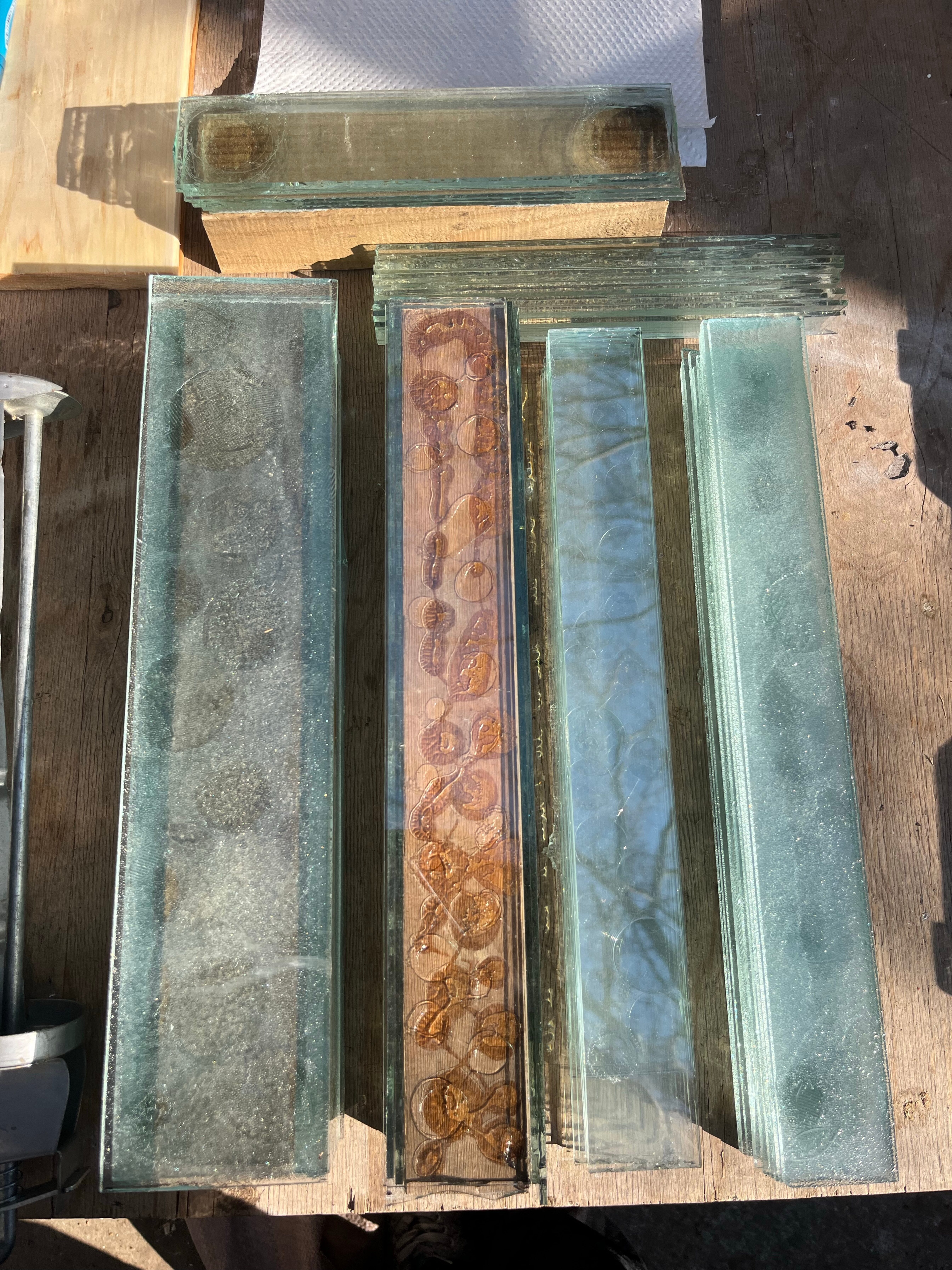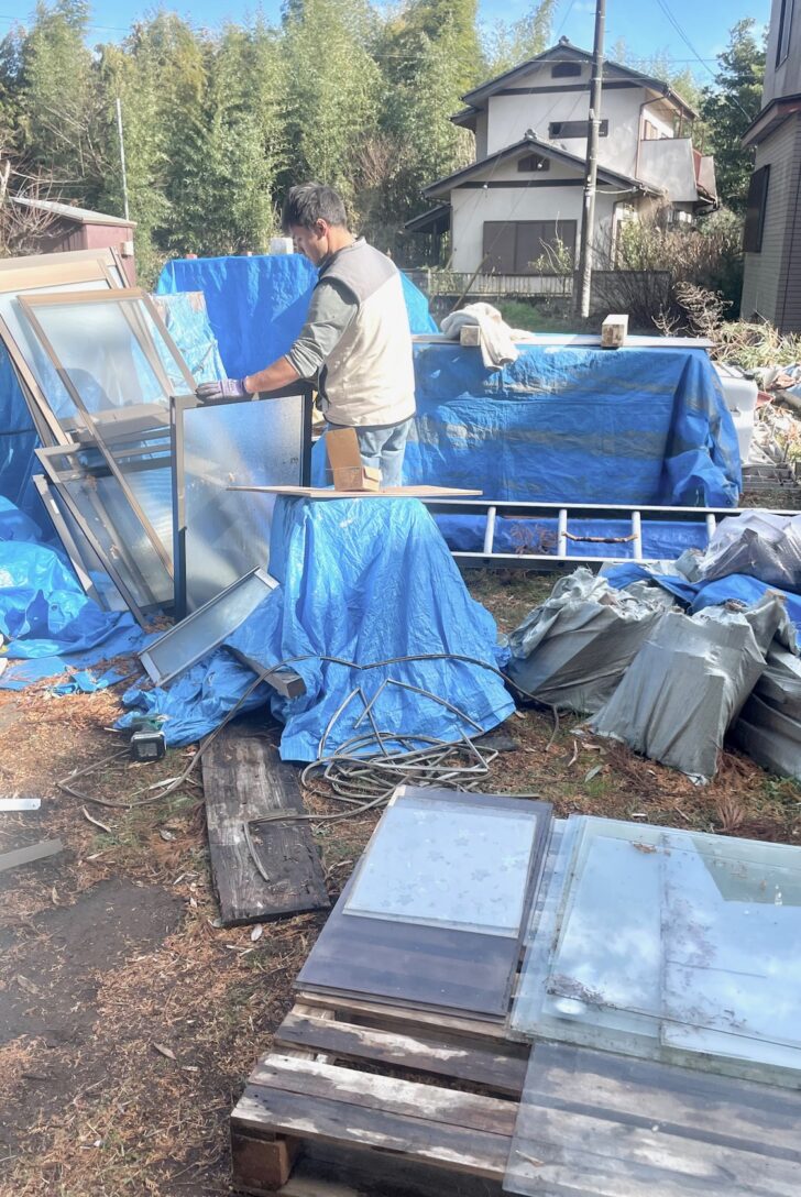 リノベーションや解体工事を行うと、不要となったアルミサッシが出てくることがある。回収してきたサッシは事務所に引き上げ、障子を分解し、アルミ部材とガラスに寄り分ける。アルミは鉄くずとして買い取ってもらい、ガラスは保管しておいて自社物件の改修やローコストのリノベーション案件などで再利用している。こうした集めた廃サッシのガラスを再利用することでshinoda coffee workshopsのショップフロントが出来上がり、現在は事務所オフィスの屋根を廃ガラスで葺き替える計画が進んでいる。そこには環境保全やCSRといった名のもとに行われる建前のリサイクルでは得られない、物質循環のダイナミズムを感じることができる。