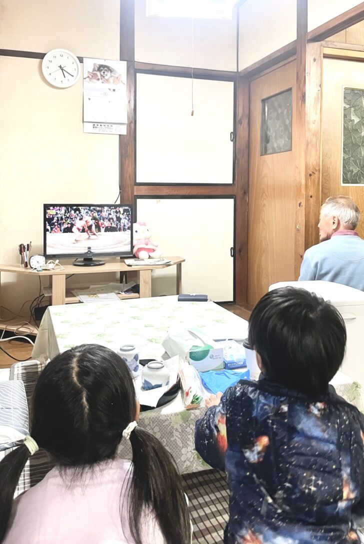小湊鉄道上総牛久駅前の廃業した食堂を地域ための居場所としてリノベーションするプロジェクト。1/14(水)に地域の方々に声をかけて餅つきイベントを開催した。地元の農家さんから提供していただいたもち米を材料に、これまた地域の空き家から出てきた杵と臼で餅をついて皆で食す。写真はそのイベント中のひとコマ。お施主さんのお父さんが食堂の一角でテレビをつけて見ていると、どこからともなく子供たちが集まり、世代を越えた相撲観戦が始まった。まさしく地域のための食堂が目指す交流の風景。テレビの力は偉大だ。地域の方々が集い交流する場をつくるために、果たして建築になにができるか、今まさに設計を進めている。