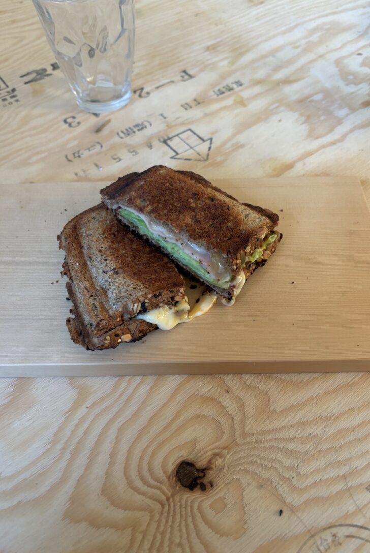 食べない時間を作って腸を休めることで、体にとって良い影響というものがたくさんあると言うことを知ってから数年、朝ご飯はコーヒーだけにして食べない主義であった。しかし、そうなってくると、朝は着替えて歯を磨き、コーヒーを入れたらすぐ仕事に向かうという、健康ばかりを優先してなんだか味気のないルーティーンになってしまっている。もう少し朝から”良い時間”を過ごすということにしたほうが良いのではないかと考えるようになり、最近は朝ごはんを意識的に食べるようにしてみた。コストコで売ってる雑穀パンに、ハム、チーズ、キャベツ、柚子胡椒を載せて、ホットサンドメーカーで焼き上げる。新築住宅で外部建具の枠としてヒバ材を使った時の、ちょうどいい大きさの端材があったので、ピカピカにサンディングしてサービングボードとして活用することにした。QOLが中々に高まった気がしている。