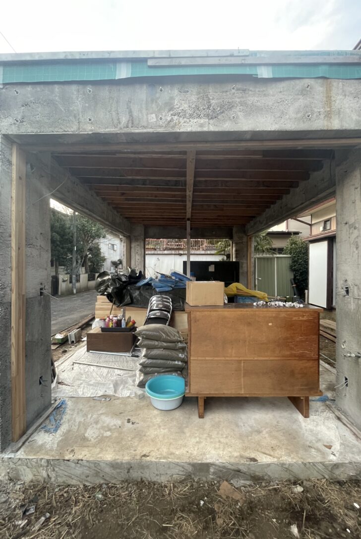 とあるマンションの解体工事が始まった。いざ壁や床を開けてみると、いろいろな発見があり、予想を裏切られるようで面白い。この現場の1階を解体してみると、本来ならば必要のない場所に断熱材が見えてきた。不思議に思い昔の図面を見てみると、反対側は駐車場であることがわかった。いわいるマンションなどにある室内駐車場である。また、床を壊すことでスペースがもっと広く使えることがわかってきた。どう使っていこうかと想像が膨らむ。たまに、壁を開けてみると材が腐っていて、交換しなければいけないなどの嫌なこともあるけれど、建物を解剖しているようで、楽しい工程の一つである。