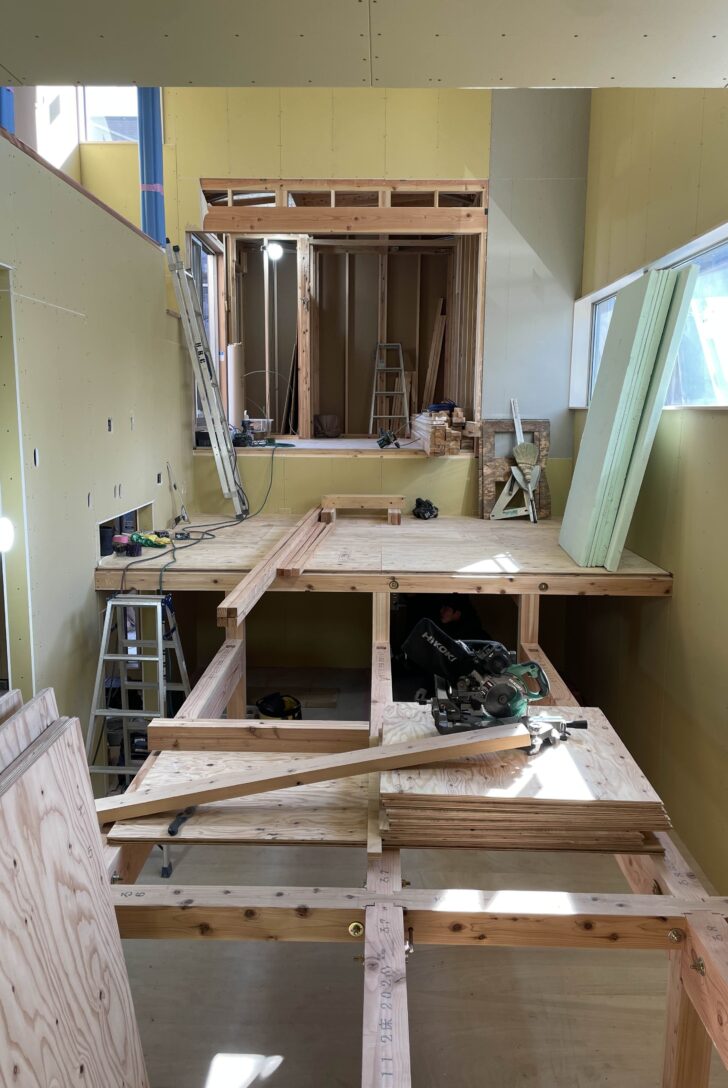 工程上後回しとなっていた床やボリュームが施工され劇的に空間が変わった。もちろん、図面を見ているのでそのような空間が立ち現れることはわかってはいるものの、実際に空間を目の前にすると、なんだか感心してしまう。緩やかに区切られている空間がとても伸びやかで気持ちいい。この建物が建築にグッと近づいた瞬間だと感じた。
