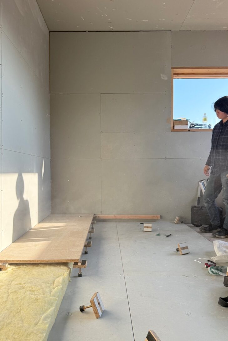 先日、住宅を建てさせていただいたお客さんと一緒に、敷地内に併設する音楽スタジオ棟をつくっている。骨組みと外壁、屋根までは職人さんにあらかじめ施工してもらい、内部の吸音材や防音壁、内装仕上げはDIYで行う計画だ。お客さんのDIYに、設計者である僕らも加わるこのやり方を、僕らはDIT(Do it together)と呼んでいる。防音は、重量による遮音と、反響を抑える吸音材の組み合わせで成り立っている。実際にパネルを持ち上げ、そのパネルの重さや、空気層の数、その間にいれる綿を見ると、たしかに防音しそうだと、肌で実感する。 知識では知っていても実際に手を動かしながら、重さや固さ、手触り、施工の大変さなどを感じるこの進め方は、学ぶことがとても多い。