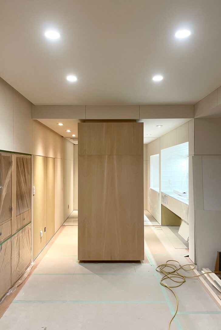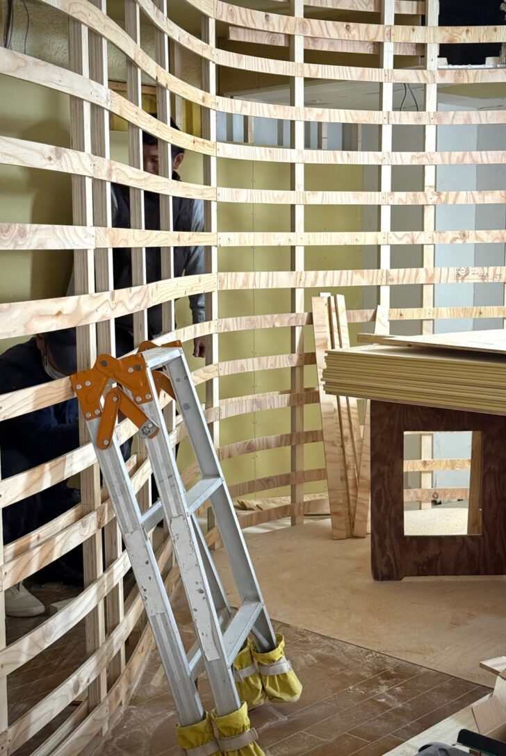 マンションの改修現場。今回の計画では、曲線が特徴的なプランを採用している。完成してしまえば隠れて見えなくなる部分だが、現場ではその成り立ちがよく分かる。曲線の壁を作るために、細い柱を細かいピッチで立て、その上から薄いベニヤを2層重ねながら曲げていく。一枚では成立しない曲面も、層を重ねることで少しずつRの形状を獲得していく。図面の中では一本の滑らかな線として描かれていた曲線も、実際にはこうした手作業の積み重ねによって作り上げられている。イメージを描くこと自体は誰にでもできるかもしれないが、それを現実でカタチにすることは簡単ではない。材料の理解、工法の理解、そして最後は職人との対話。図面だけでは完結しないこの往復によって、少しずつ建築が立ち現れるのである。