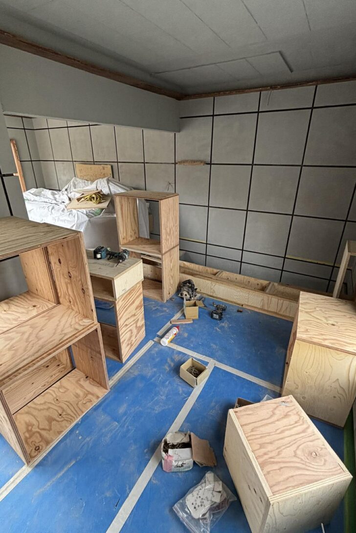 階段へ転落防止のための腰壁とコレクションのディスプレイを兼ねたものを大工さんに作ってもらっている。作り方としてはシンプルで、onrebaseで床や壁の材料として多用されている、端材の600mm角の構造用合板で箱を組んでそれを組み上げていくというものだ。箱単体だけを切り取って見るとインパクトとしてはそこまで高くないが、背面の壁のグリッドに合わせて作ることで建物全てにデザインが統一がされている状態ができ、中々に良いものになったと思う。最近は単純でシンプルなものでいかに設計強度を高めることが出来るのかということをよく考えている。リソースが限られている状況においては、最小工数で最大効果を得ることは非常に大事である。合理的だけれども、それと同時に心にグッとくるものをこれからも作っていきたい。