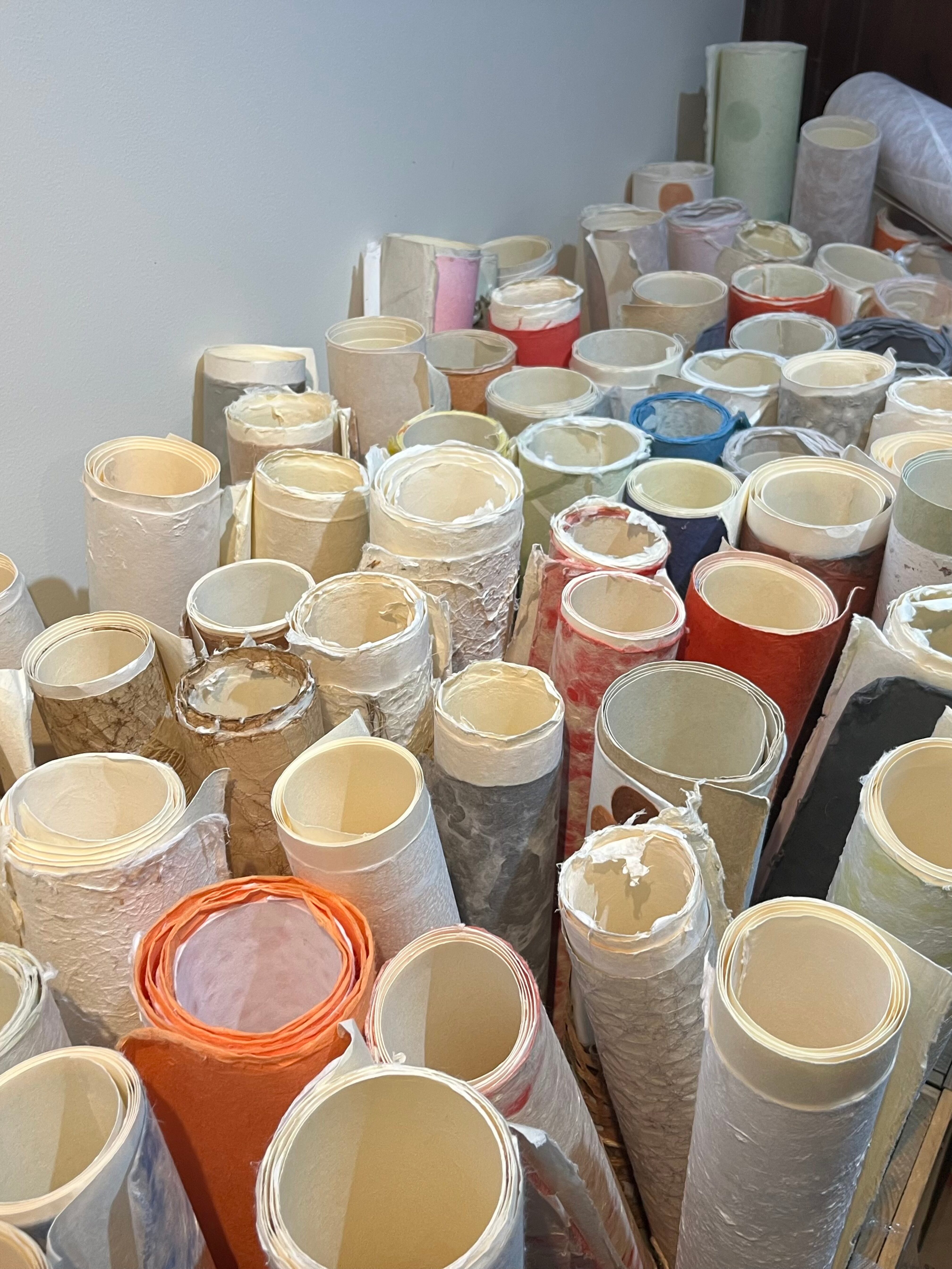 現在担当させていただいているプロジェクトで越前和紙の使用を検討している。越前和紙は私の出身地の特産品で、熟練の職人が手漉きで製作しているためかなり高価なものだが、端材やサンプル品が安く手に入る和紙工房に出会うことができた。様々な色やテクスチャの手漉き和紙が選び放題のため、今回のプロジェクト以外にも可能性がありそうだった。地元の製品を離れた地で提案できることの喜びと、少し自慢げな気分になった。壁紙のように大きな面積の施工には向かないが、パッチワーク的なデザインや、部分的にアクセントを加えるにはもってこいだと思った。