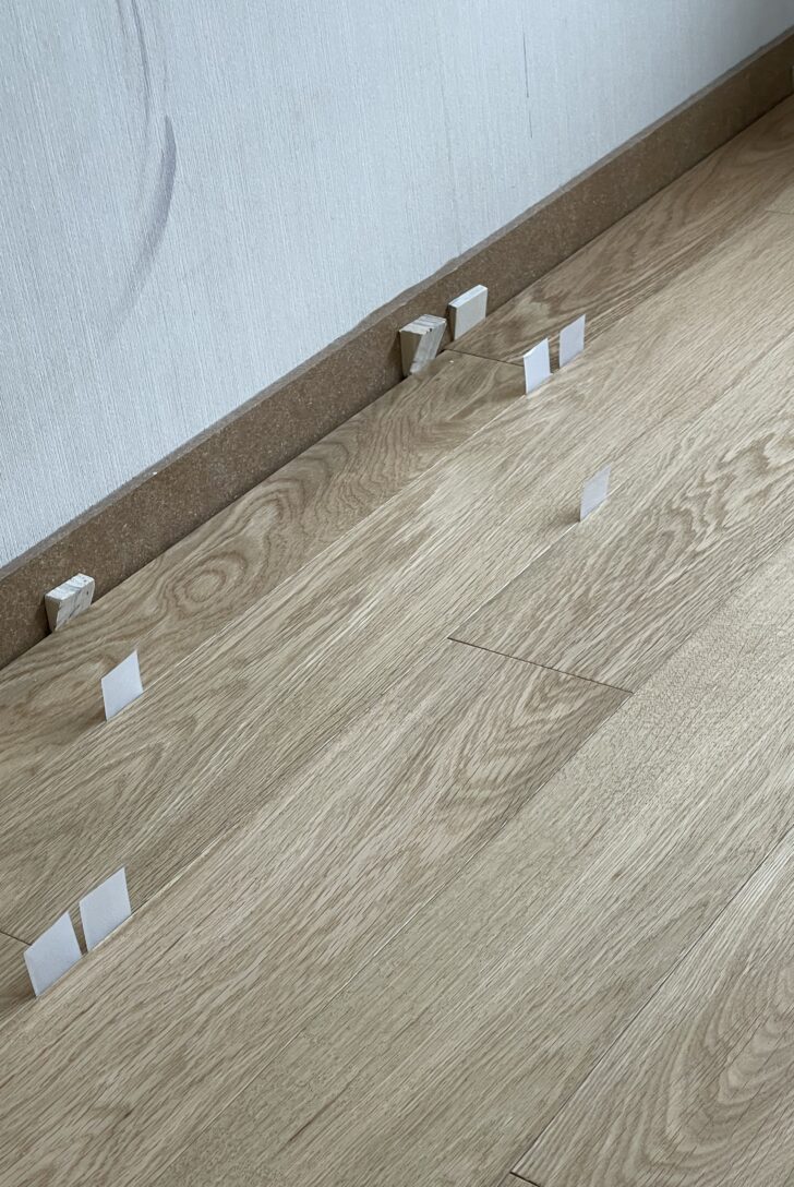 里山から切り出した広葉樹で、オリジナルのフローリングをつくるため、表面材となる樫の突板の検品を行った。丸太をスライスしてつくられていることは分かっていたが、実際に一枚一枚を手に取ってみると、層によって木目の表情がまったく違うことにあらためて驚かされる。また、大きな節欠けがあったり、黒ずみが出ていたりする層もあり、製品にしていくには、想像以上に細やかな判断が必要になる。これまでフローリングを「製品」としてしか見てこなかったが、その裏側にも、こうした選別の積み重ねがあるのだろうか。どの層を選び、どの表情を使うか。木に実際に触れながら、里山の木の価値と、製品としての質とは何か、考えさせられた。