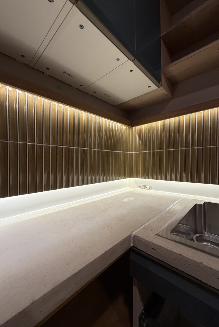 マンション改修の現場で、キッチンに計画していたタイルが貼られ、間接照明も入り、ほぼ完成の姿が見えてきた。今回の設計では、空間の印象をつくるための演出的なふかし壁を「セカンドウォール」と呼んでいる。構造体や既存の壁とは別に、もう一枚の壁をつくることで、素材や光、奥行きによって、マンションのような限られた空間の中に変化を与えるための装置だ。キッチンには、お施主さんがとても気に入って選んだ、波打つような表情のタイルが入った。この家では、ほかの部屋にも、それぞれの素材に小さな物語がある。セカンドウォールを見るたびに、こだわって決めたプロセスを思い出したり、その質感や手触りに、ちょっといい気持ちになるような、日常の中に小さな特別をちりばめることができているのではないかと思う。