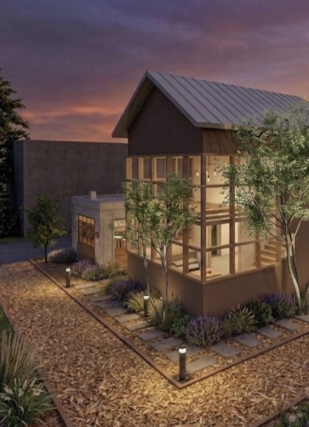 引渡しを終えた家に、灯りがともった。分譲地の一角に現れたその明かりは、ただ室内を照らすだけでなく、夜道にもやわらかく光を落としている。LDKのような主な生活空間は1.5階の高さにあり、前面道路から暮らしの中を覗き込むことはできない。けれどその距離感があるからこそ、周囲に閉じるのではなく、住む人の気配や生活のあたたかさだけが、そっと街ににじみ出ていくのではないかか期待している。光を独り占めするのではなく、まわりに少しお裾分けするような建築になっていて、これからここで積み重なってい暮らしが、とても楽しみです。