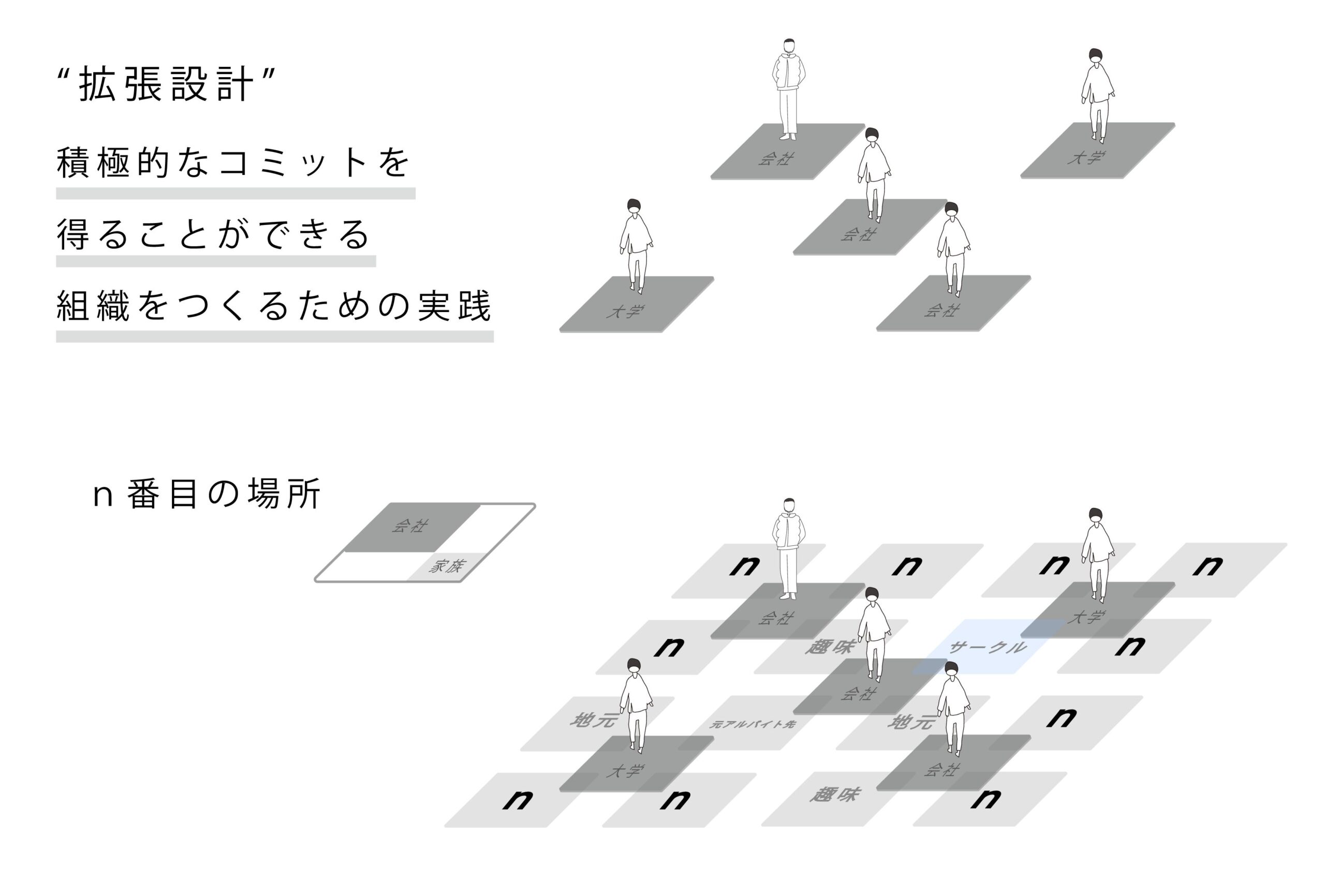 建築設計事務所をやっていると、明らかに社会には存在して然るべきだろうと思うプロジェクトなのに予算がないから実現できないもの、もしくは建築士の設計料が払えないために建築設計を提供してもらうことができないものの相談を受ける。または、自分達が獲得した空家や、事務所の機能を拡張していく際の設計を自ら行う必要があったりする。設計料が発生しない、所謂「儲からない」プロジェクトをその基準で判断していれば、空家や過疎地のプロジェクトなどは決して実現されないし、世界は同じような建物、同じような素材、同じような風景が量産され、どんどん意味を失っていくことになるだろう。「拡張設計」はそういったプロジェクトの設計者枠を学生や元パートタイムスタッフなどに拡張し提供することで、人的リソースを提供してもらう代わりに事務所のフルタイムスタッフはプロジェクトディレクションとプロジェクトマネージメントを行う。それは同時に彼らの3年後の所内での役割をロールプレイしてもらうことも意図されている。建築設計事務所の関わり代を大きくし、一つの職場、一つのキャリア、一つの人生ではない、n番目の場所を持つ人が増えることで起こりうる多様で豊かな状況を社会に提供する方法を試行している。