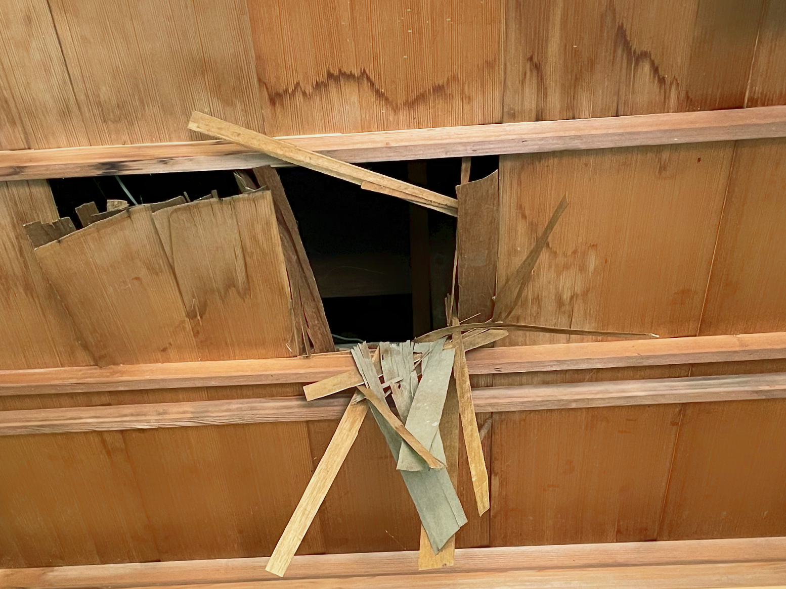 開宅舎からの依頼で、元空き家だった物件の雨漏り調査に伺った。立派な門や庭を備えた豪邸で室内の意匠も細部まで凝っていたが、特に目を引いたのが、玄関から入ると正面に見える丸窓障子だった。住宅で目にするのは初めてだったが、即座に「となりのトトロ」のワンシーンが脳裏に浮かんだ。さつきとメイが新しい家を駆け回る、ワクワクする場面だったと記憶している。丸窓障子の、部屋と廊下の間に窓があるという不思議さとその丸い形の可愛らしさに、子どもながらに心がときめいていたことをよく覚えている。そんな心惹かれたデザインの本物に、20数年越しに出会えた嬉しい日だった。