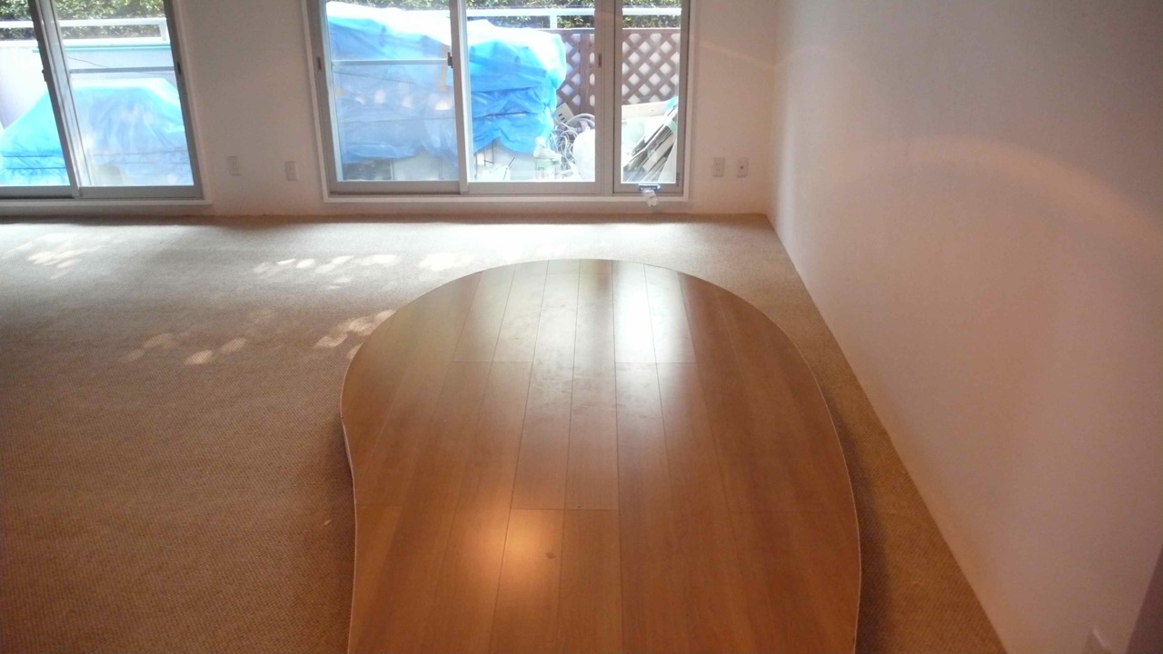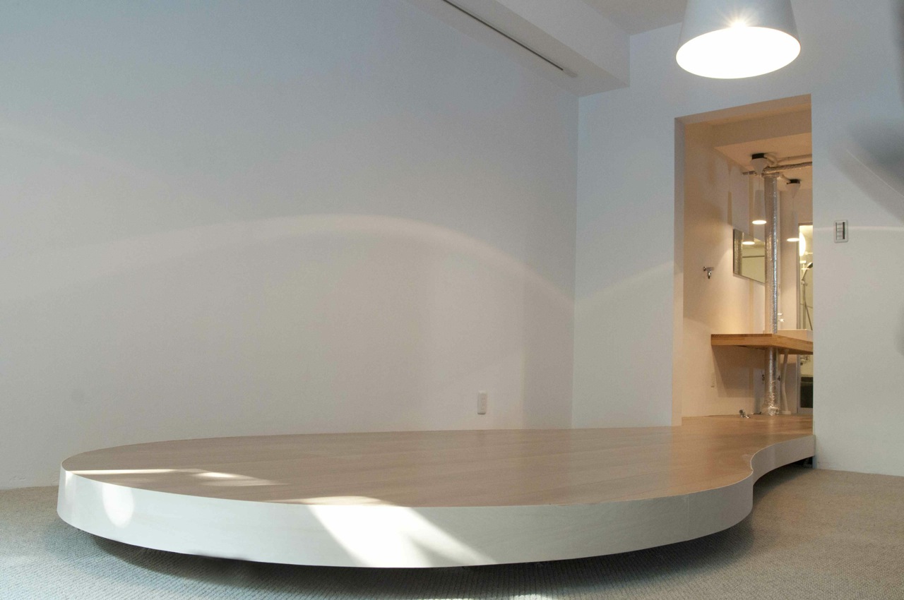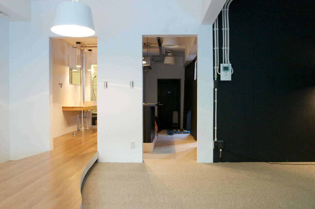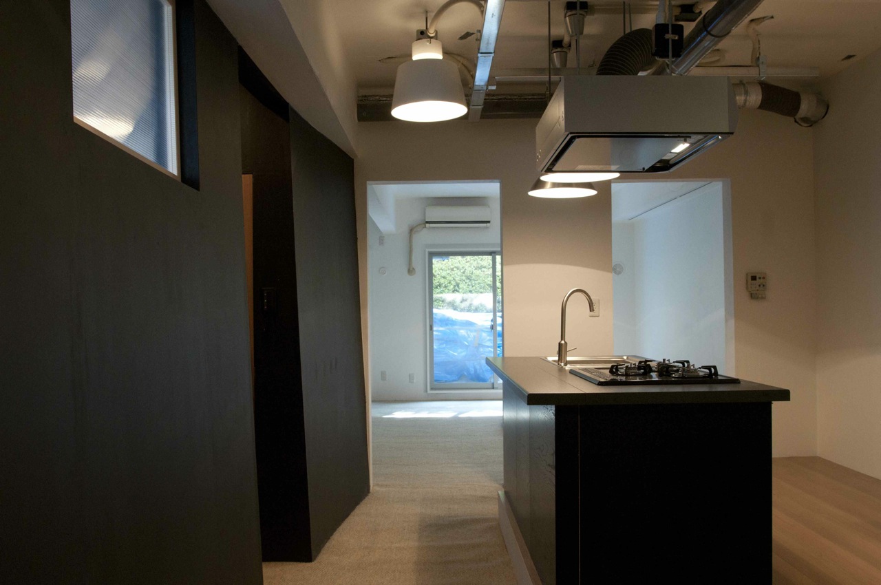 マンションの一室を譲り受けた若い施主は一人暮らしであったため、3LDKという間取りは不要であった。広くて気持ちのいいリビングルームとコンパクトで機能的な水廻り、そして必要十分な寝室という1LDKへの更新を計画した。しかし、躯体の構造上部屋を南北に分ける壁が撤去できなかったため、リビングルームと水廻りとのつながりを作る方法が必要であった。そこで、配管のために持ち上げられていたキッチンの床を体力壁の開口部分を越えてリビングルームまで引き出してくることによって、キッチンに所属している床だが空間としてはリビングルームにあるという場所を作ることができた。床の素材を変えることと、張り出した部分をリビングルームの床から浮かせることで別の空間に所属していることを強調し、空間に多少の複雑さが作られることを期待した。また、限られた空間を最大限に利用するために、寝室の壁を傾斜させ、キッチン側では立って過ごすために上部の空間を広く、寝室では座るまたは寝ているために下部の空間を広く取り合うこととして合理的な空間の利用ができるよう考えた。