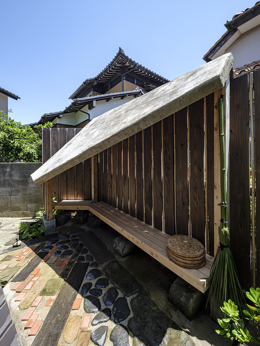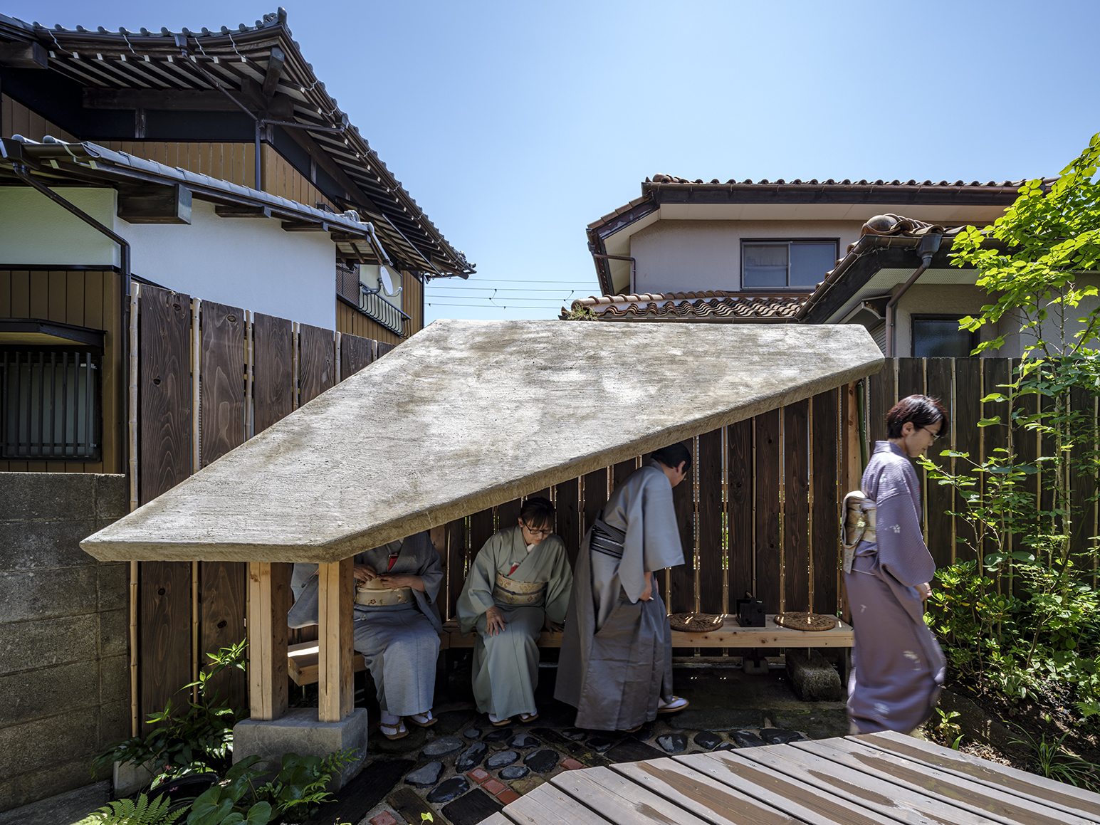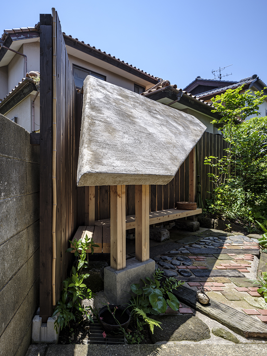 庭師の武田屋作庭店が露路の拡張を行い、その上に腰掛待合を計画することになっていた。ランダムに感性で敷き詰められたレンガや瓦といった瓦礫が「こうあらねばならない」という固定観念を崩しありえた未来を作っていく、これに呼応するべく建屋の形態は三点で支えられた変形片流れとし、屋根には基礎工事時に掘り出された現場の土を練り込んだモルタルで包み込んだ。破風やケラバ面も包んでいるため縮小された茅葺き屋根の風情にもにて野趣あふれる仕上げとしている。撥水加工などは行わずに刷毛で少し撫でて凹凸を作り、湿気が残り苔生すことを期待している。屋根面は最奥の空間でと低くなり、必然的に頭を下げなければならない。躙り口のないこの茶室において、通常の茶事の設えではないが一度客人の関係性をフラットにする装置となることにも期待している。また、この斜めに口の開いた屋根によって、明らかに路地内での指向性が定められ、あたかも矢印によって方向が指示されているかのような効果が生まれている。そして、このモルタルと土という重たい物体が、華奢であるかないかわからない程度の柱によって浮かべられているものの中に身体を預けるという行為が、不安定さや不安から来る興奮となって茶事への期待を否が応にも高めてくれるのでは無いかと考えた。