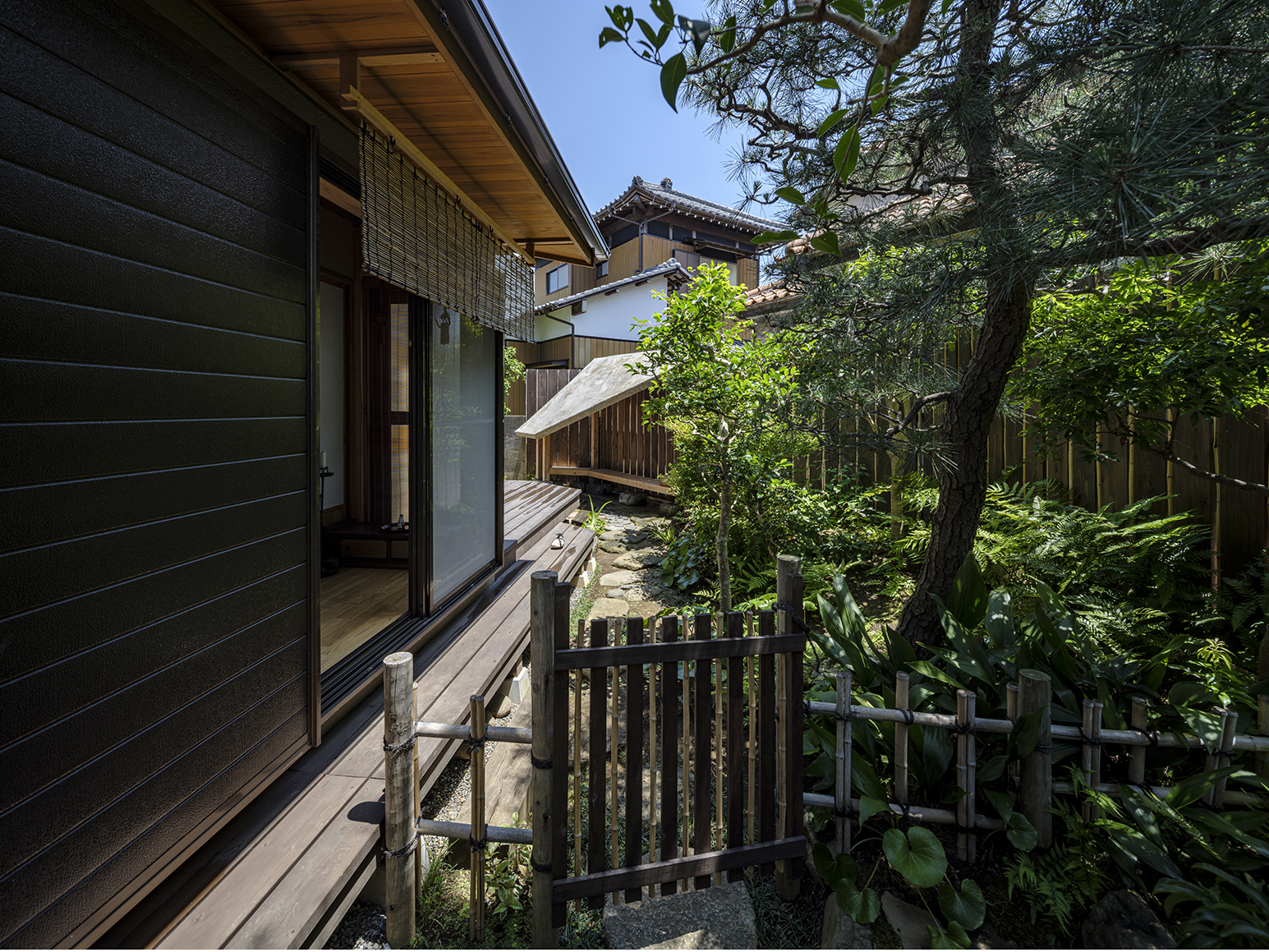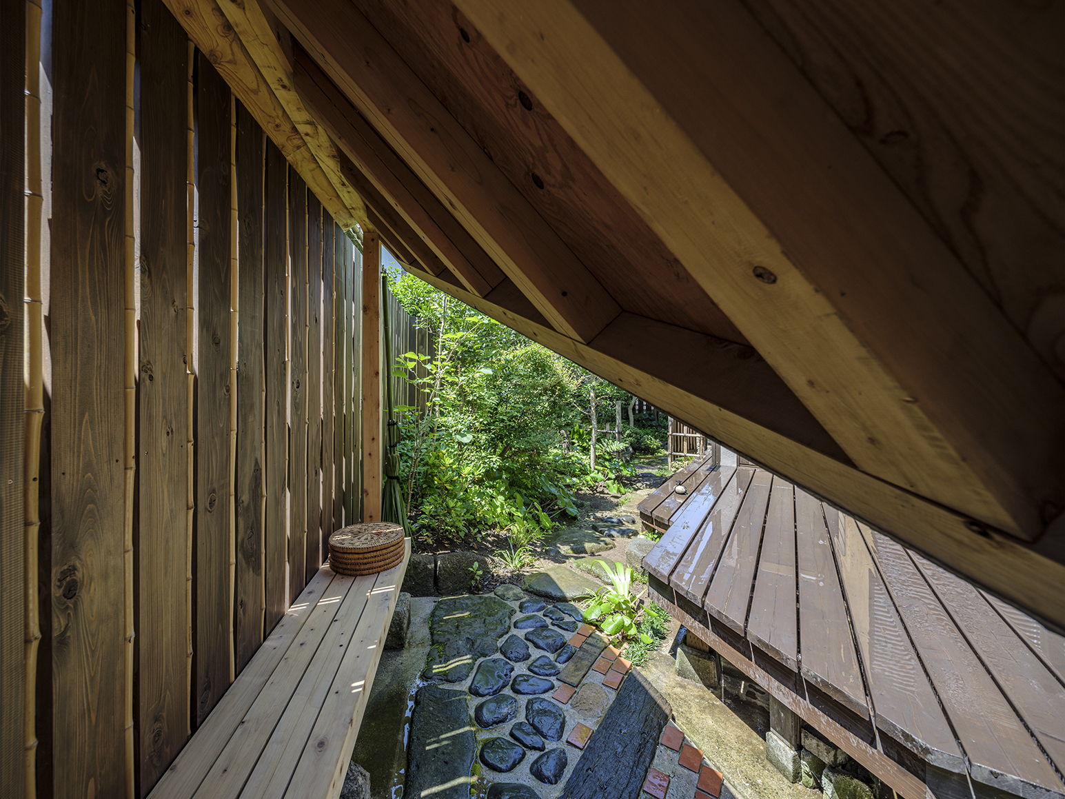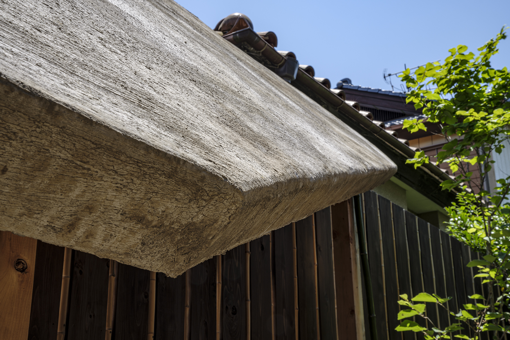 庭師の武田屋作庭店が露路の拡張を行い、その上に腰掛待合を計画することになっていた。ランダムに感性で敷き詰められたレンガや瓦といった瓦礫が「こうあらねばならない」という固定観念を崩しありえた未来を作っていく、これに呼応するべく建屋の形態は三点で支えられた変形片流れとし、屋根には基礎工事時に掘り出された現場の土を練り込んだモルタルで包み込んだ。破風やケラバ面も包んでいるため縮小された茅葺き屋根の風情にもにて野趣あふれる仕上げとしている。撥水加工などは行わずに刷毛で少し撫でて凹凸を作り、湿気が残り苔生すことを期待している。屋根面は最奥の空間でと低くなり、必然的に頭を下げなければならない。躙り口のないこの茶室において、通常の茶事の設えではないが一度客人の関係性をフラットにする装置となることにも期待している。また、この斜めに口の開いた屋根によって、明らかに路地内での指向性が定められ、あたかも矢印によって方向が指示されているかのような効果が生まれている。そして、このモルタルと土という重たい物体が、華奢であるかないかわからない程度の柱によって浮かべられているものの中に身体を預けるという行為が、不安定さや不安から来る興奮となって茶事への期待を否が応にも高めてくれるのでは無いかと考えた。