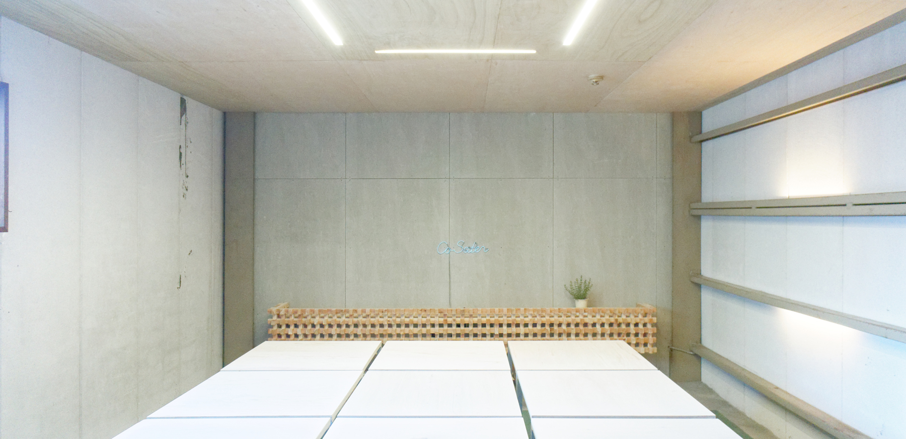 また、2Fは店舗の構造に変更を加えることができなかったため1Fとはっきりと設えを変えるようにした。奥のカウンターに1Fと同じ木組みを用いて構成を反復させつつ、既存床や壁面をほとんどいじらないことで秘密基地や屋根裏部屋の様なワクワクする雰囲気が、利用者のクリエイティビティや起業マインドを喚起することを期待している。