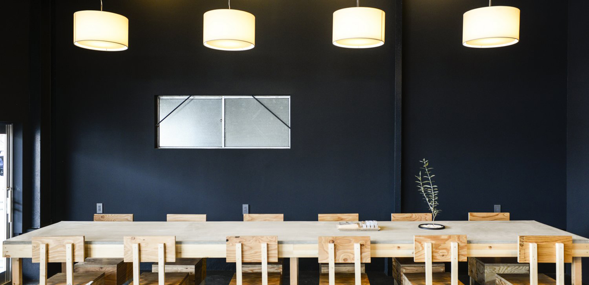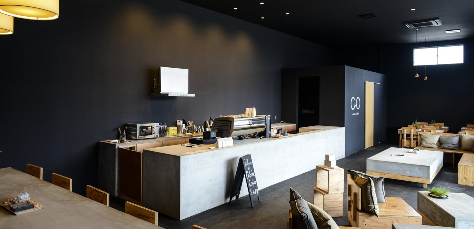 内装は全て塗装仕上げでカウンターやテーブルなどの天板になる部分はモルタル、椅子やテーブルの脚にまた建具には木材を使用した。できる限り既製品を使わないことで新建材の既製品だらけの一般家庭ではできない体験が、この店舗を個性的にするように計画した。