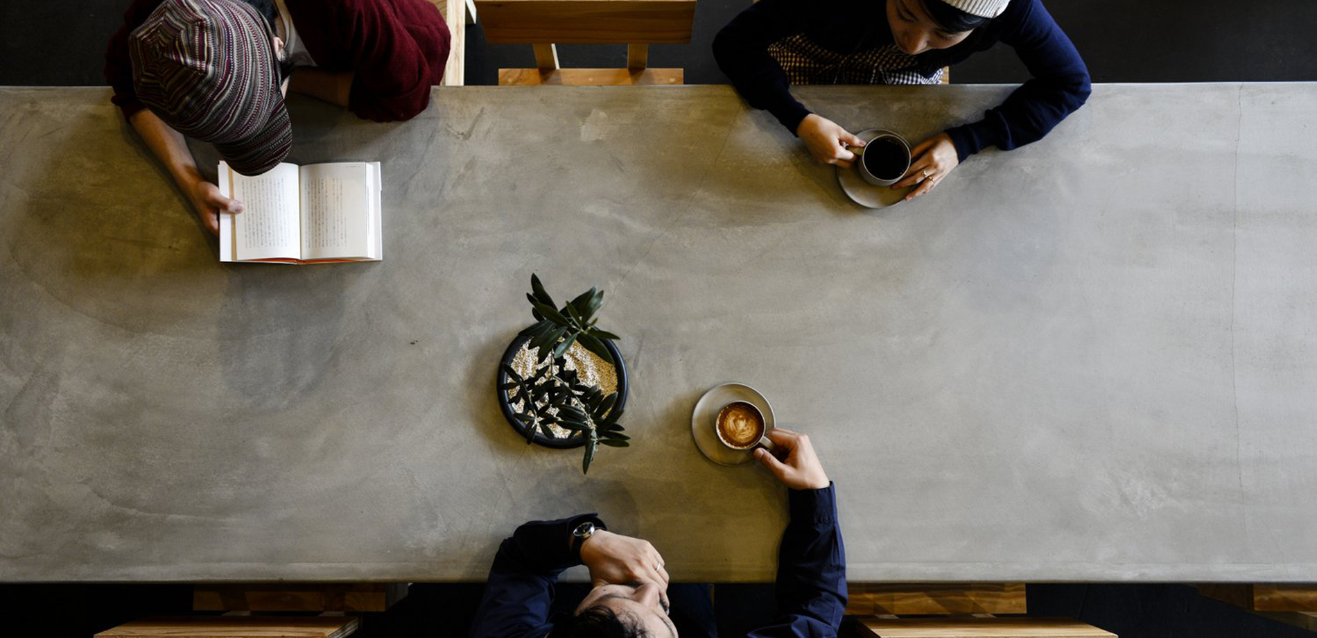 また、開口部の限定された店舗では外の緑を感じることが難しいので、各テーブルに緑を配するためにポットが埋め込まれている。それぞれに違う表情の植物とテーブルの天板が何度も脚を運んでくれる常連客にいつも新鮮な気分を提供できればと考えた。