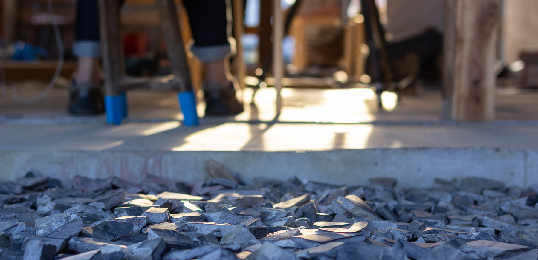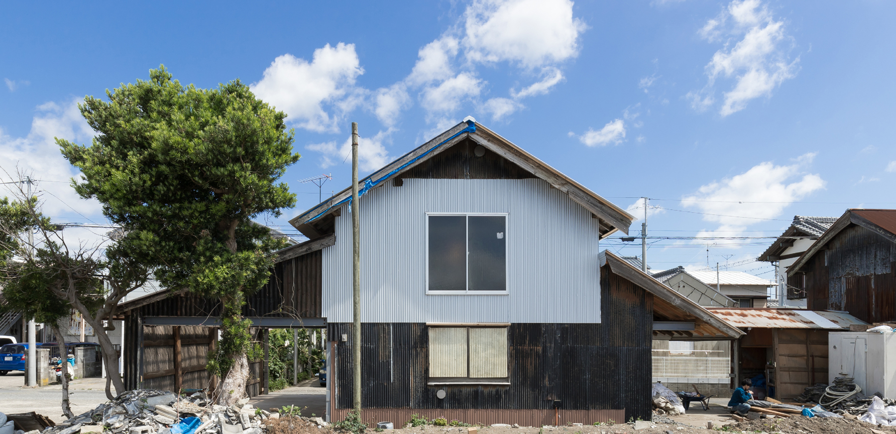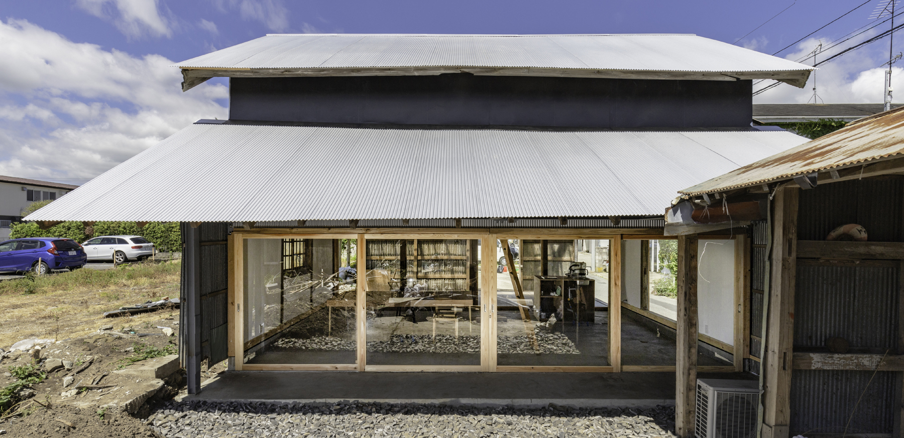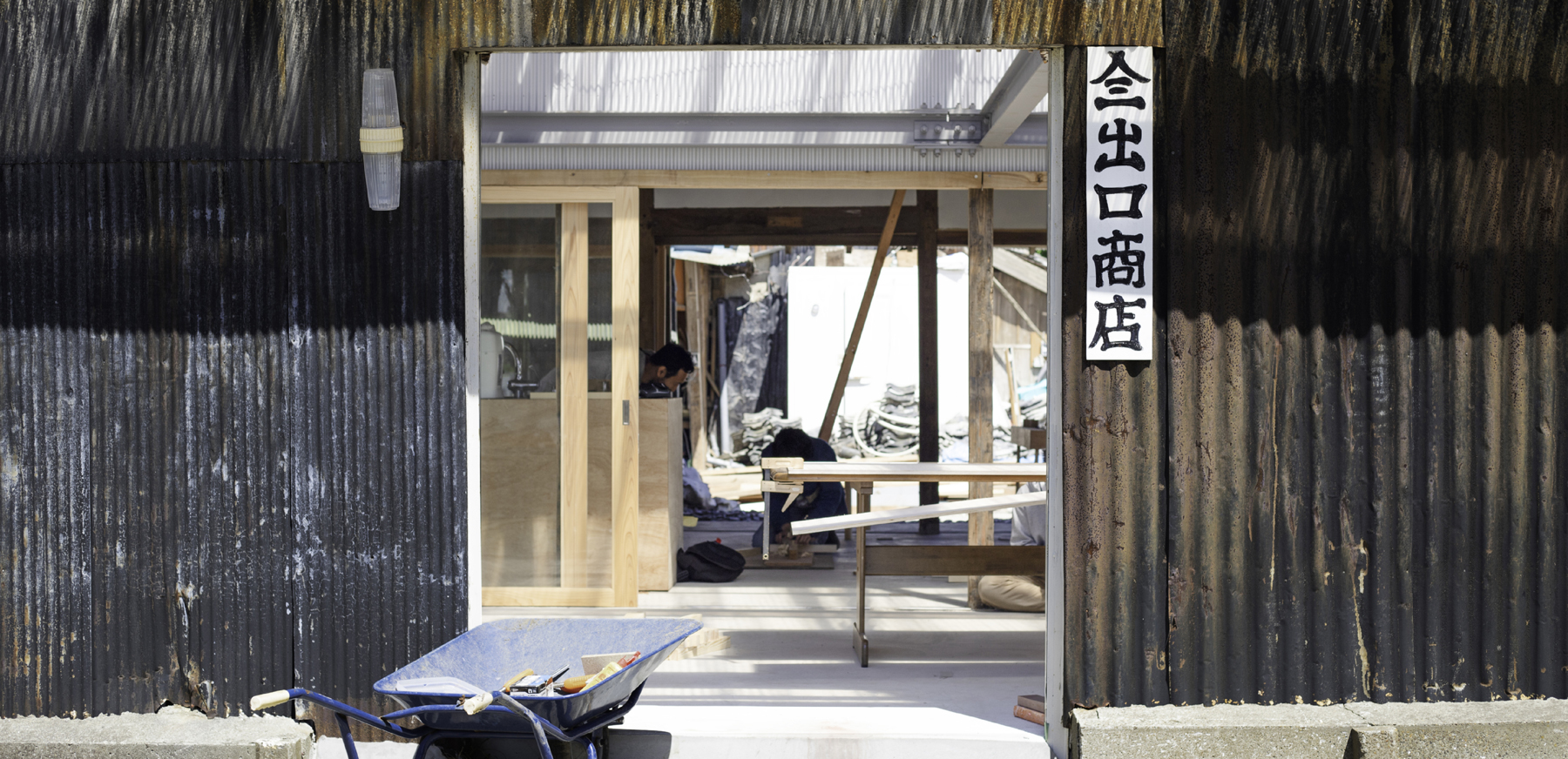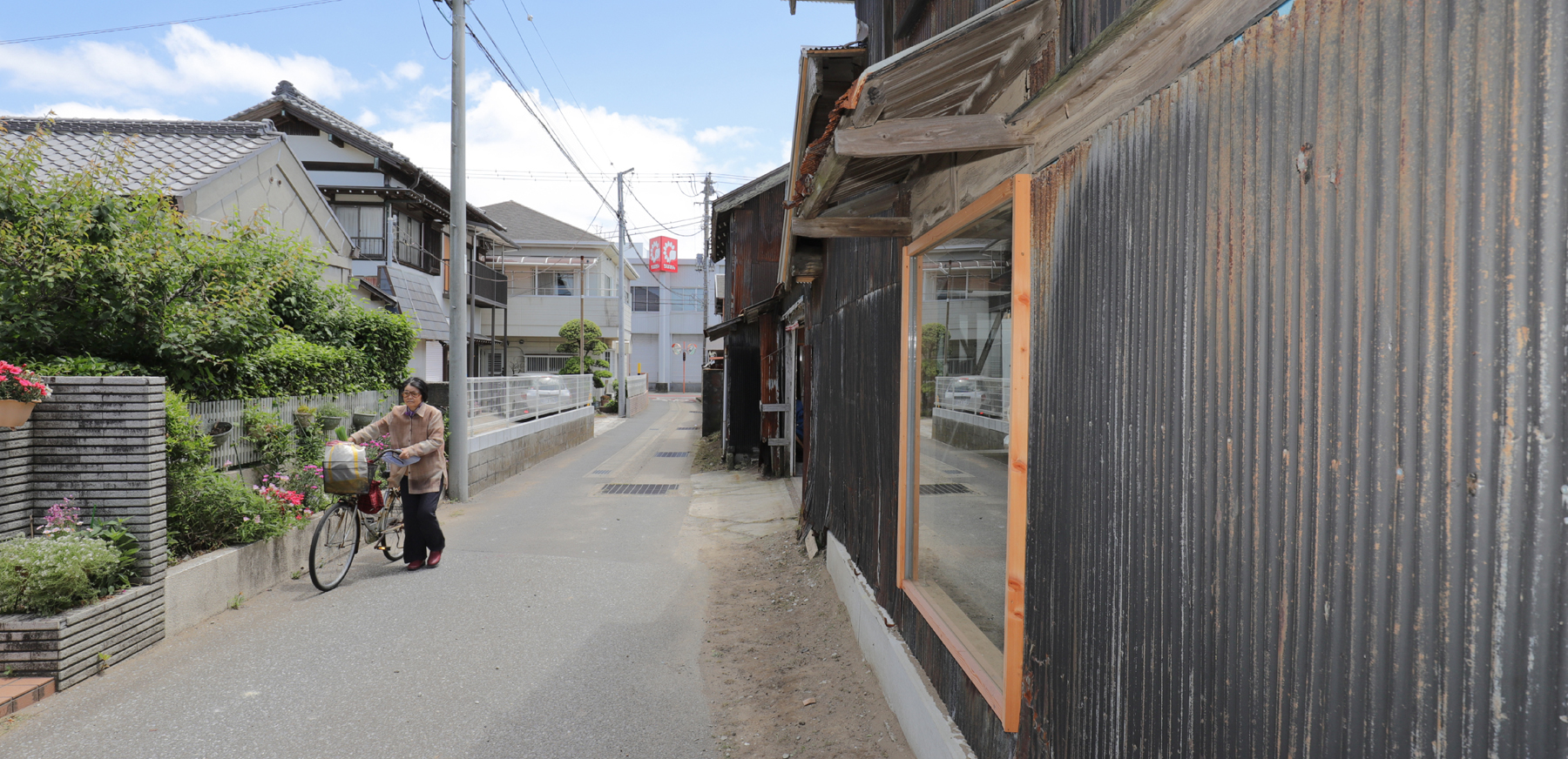 床面は基礎スラブをそのまま仕上げとしてある。庇の下には砕石が敷き詰めてあるのだが、これは古い瓦を砕いて再利用したもので、外装のトタンも年代はあまり古いものではないのだが、海の町の人々がよくトタンを用いて倉庫などを作っている雰囲気を残すためにそのままにしている。