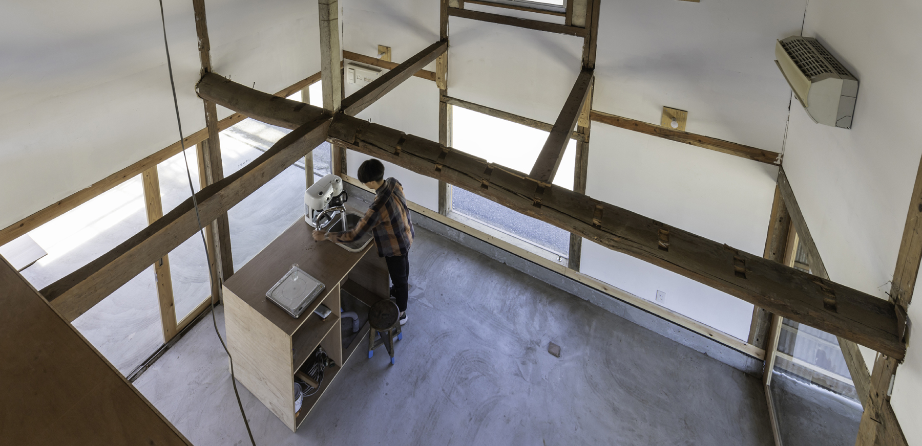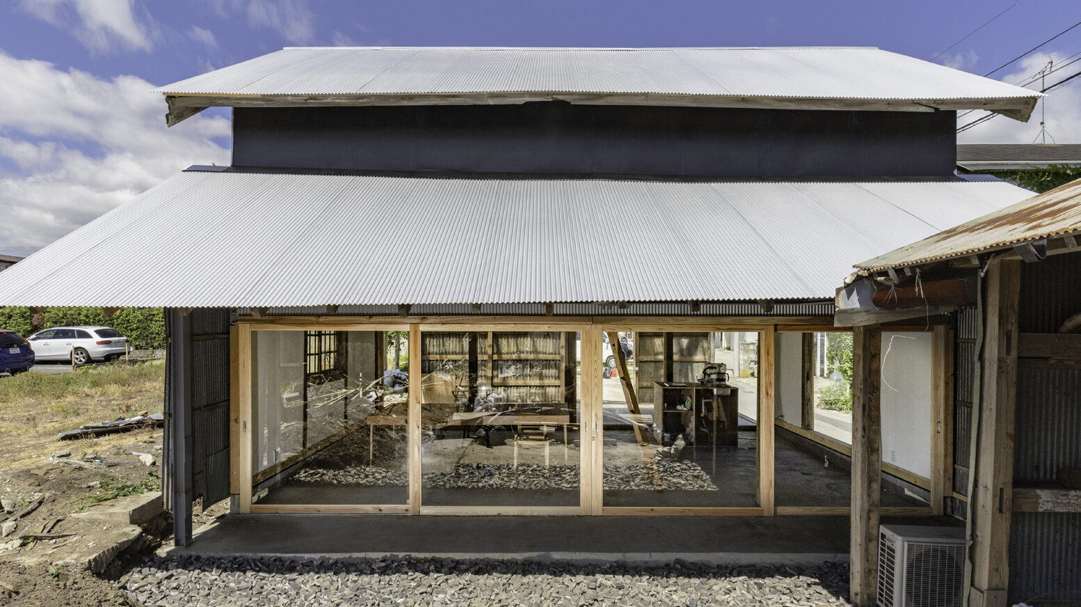 それとは反対に、学生たちの作業への集中や地元の人々との適度な距離感のための緩衝材として、南北面の壁は既存のままに残すこととした。開口部を作ることで弱くなった耐力は新しく鉄骨の骨組みを挿入することで補強とし、庇の受けや出入り口のゲートとして既存建物に溶け込むように配慮した。