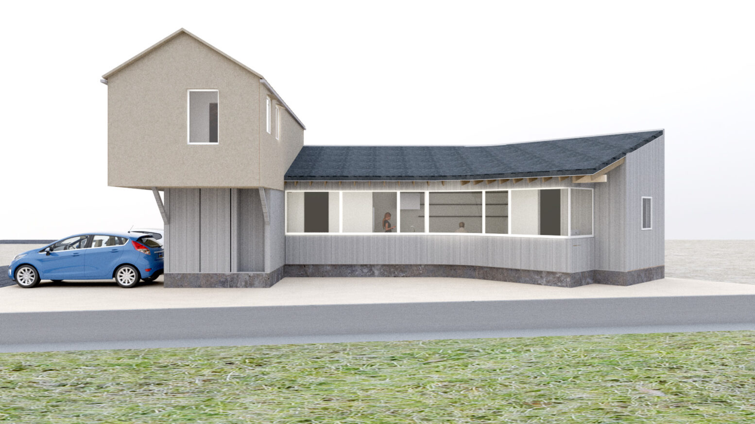 この住宅の南面ファサードは宙に浮いた家型のボリュームが特徴的である。周辺環境への応答の結果、北側にむけては大きく開口をとった反面、南側にはほとんど開口部を設けていない。壁がそり立つ様子は、近隣の戸建て住宅の面構えとは似ても似つかない姿をしているが、この典型的な家の形を想起させる切妻屋根のボリュームがこの住宅を家たらしめている。その姿はいわゆる”普通の家“と比較すると家らしくないとも言えるし、むしろ最も家らしい形をしているとも言える。どれも似たような”普通の家”が立ち並ぶ住宅街において、はたして普通とはなにか、個性とはなにか、家とはなにか。そんな思索がこのファサードに表れている。