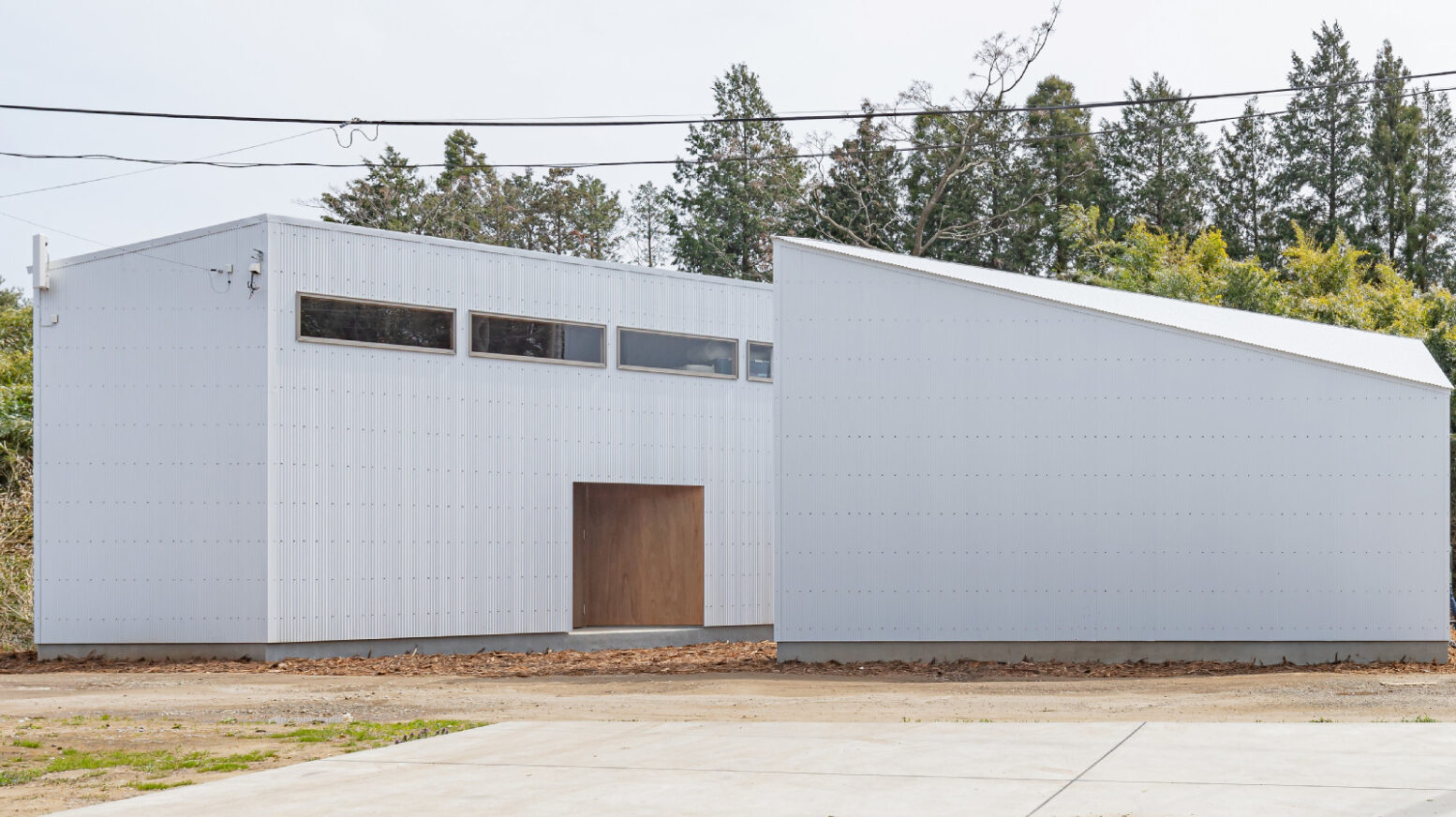 施主夫婦は二人暮らしに快適な平屋と、趣味であり副業である自動車の整備ができる広い土地を探していた。千葉県市原市の中心地から車で30分ほど離れた郊外団地の端、幹線道路からは数本奥まった県道沿いで、条件良く100 坪の土地が手に入った。