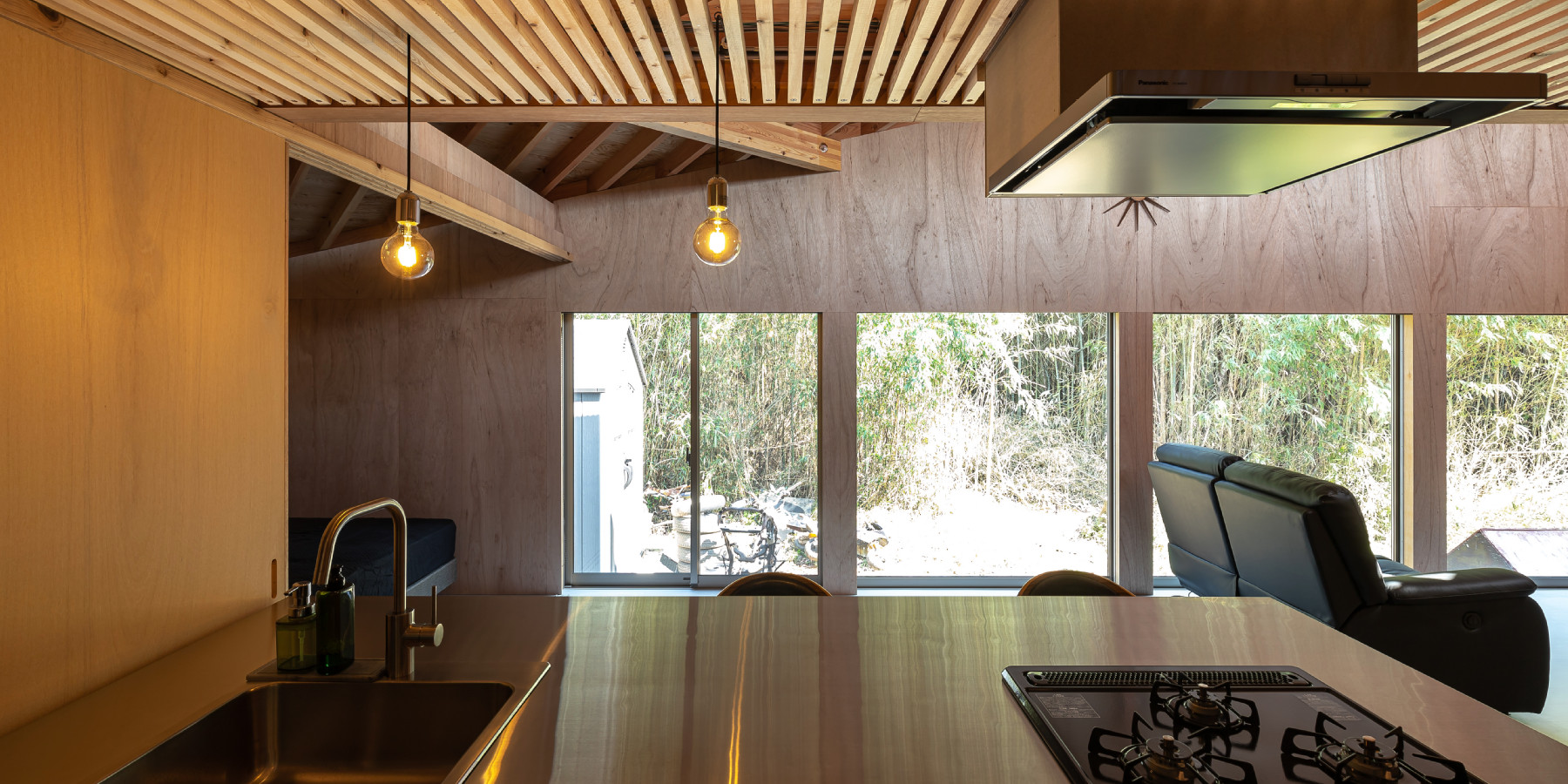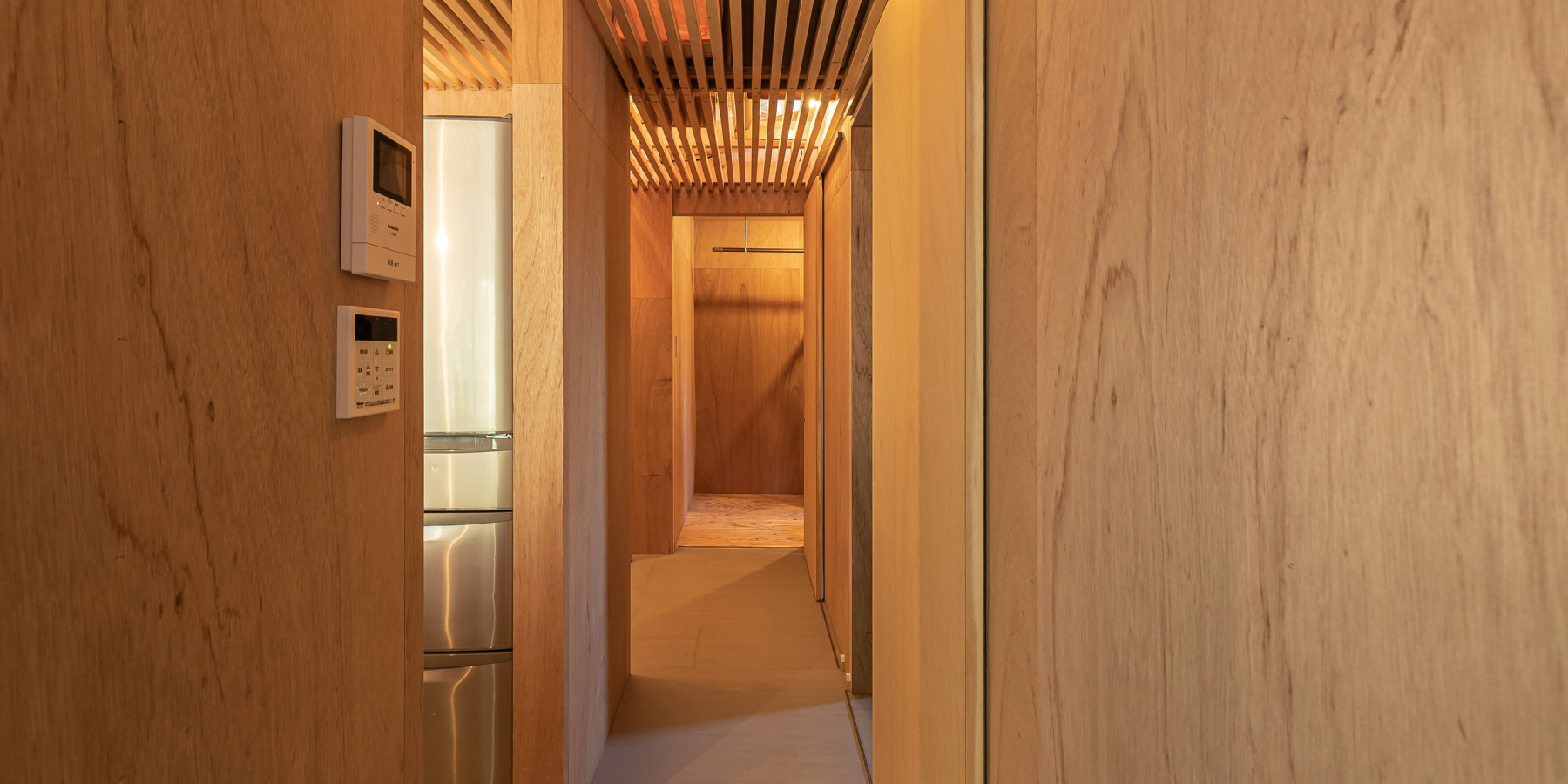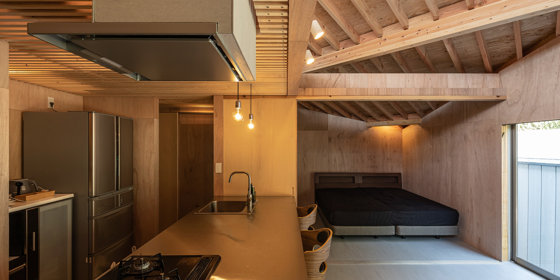 住戸部分では屋根架構の垂木をそのまま見せ、内壁はラワンベニヤ、床にはPタイル等、コストを抑えつつもフェイクやプリントではない、経年変化することのできる素材を仕上げにセレクトしている。
