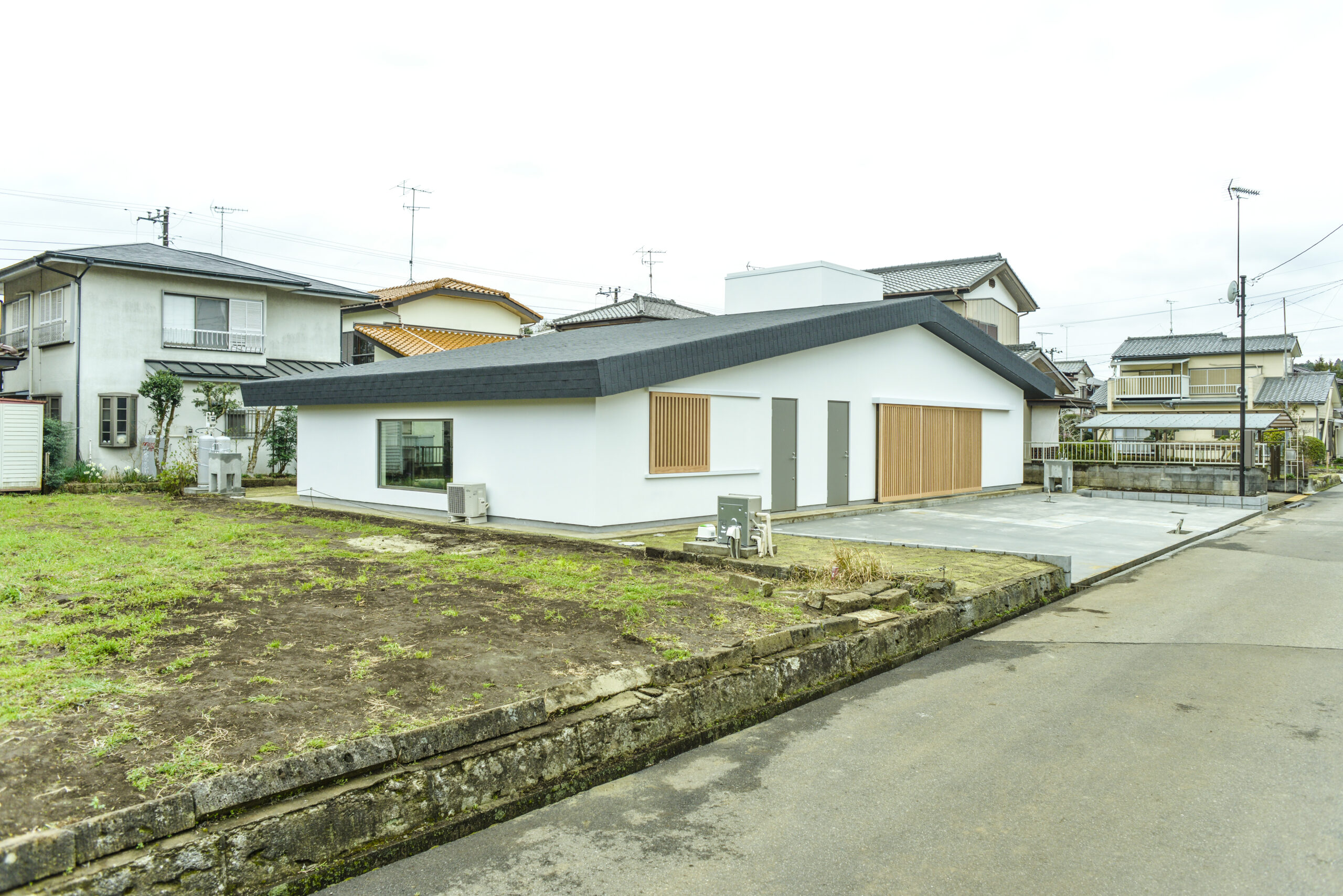 この新しい家の建つ千葉県市原市の工業団地は、自然豊かで農業などと生活圏が近く、田んぼの状況や蛙の鳴き声で季節の移ろいを感じることができる。道端には四季折々に草花が咲き、小川では子供達が釣りをし、山の中では虫取りができる。そんな郊外団地に40年ほど前に建てられた親世代の家を取り壊し、隣の敷地を買い増して新築住宅を建てることになった。
