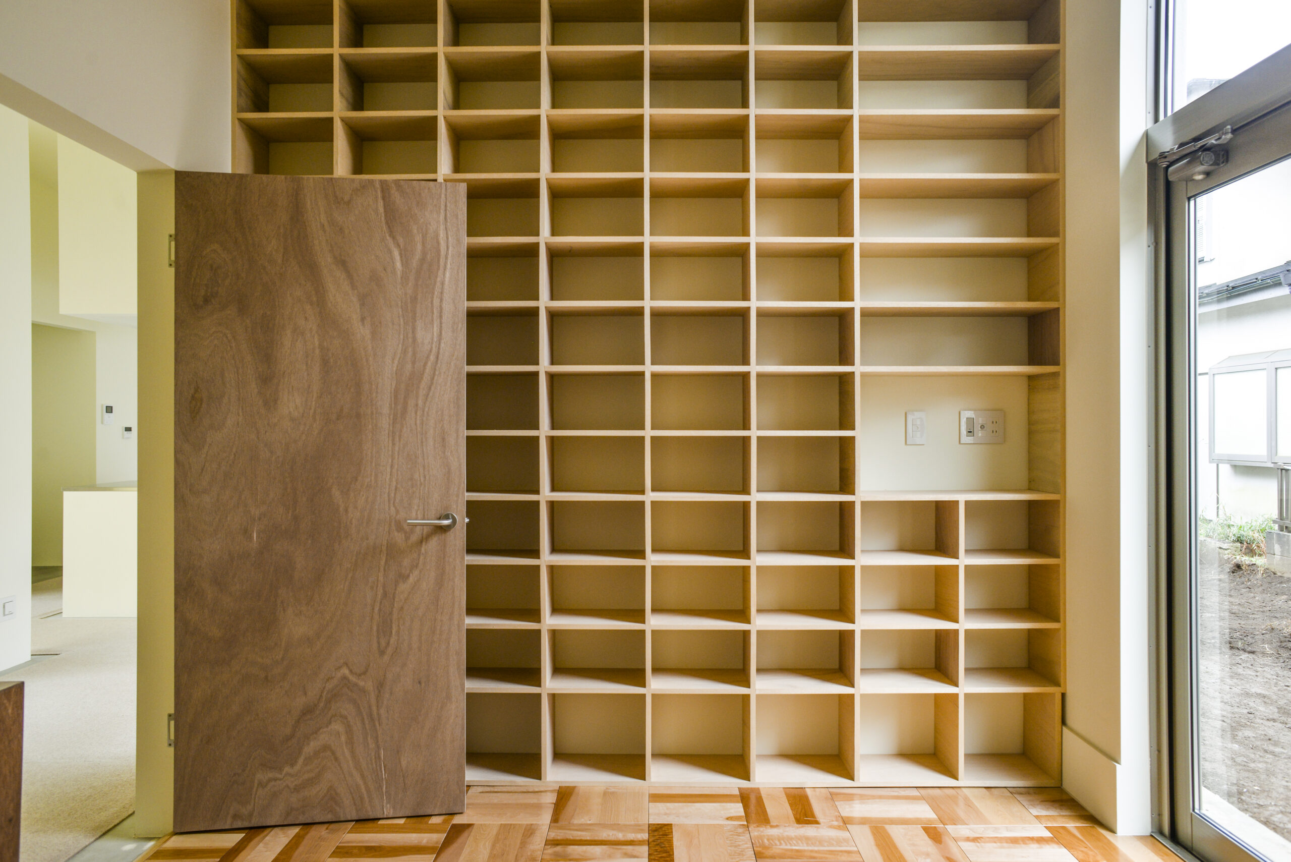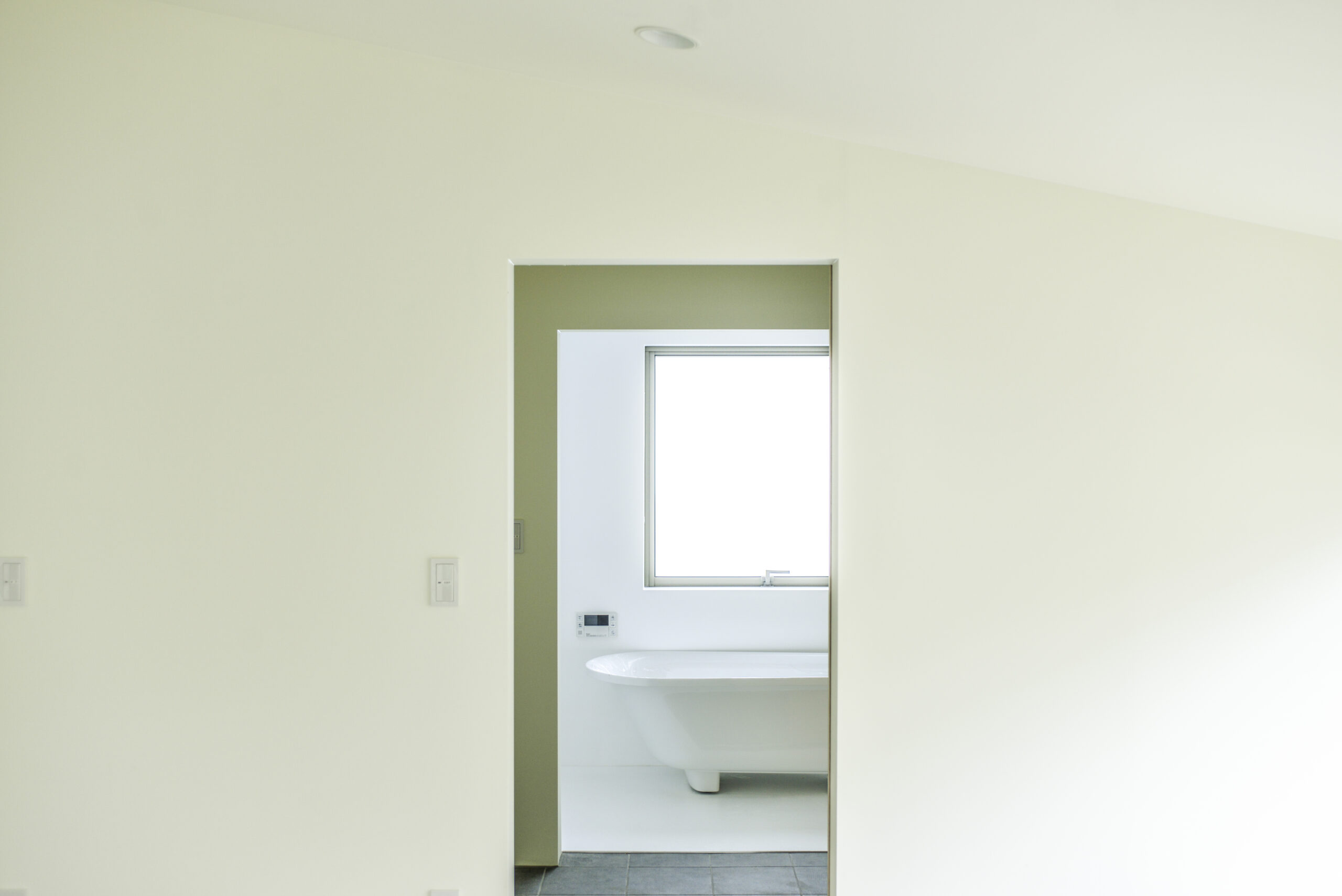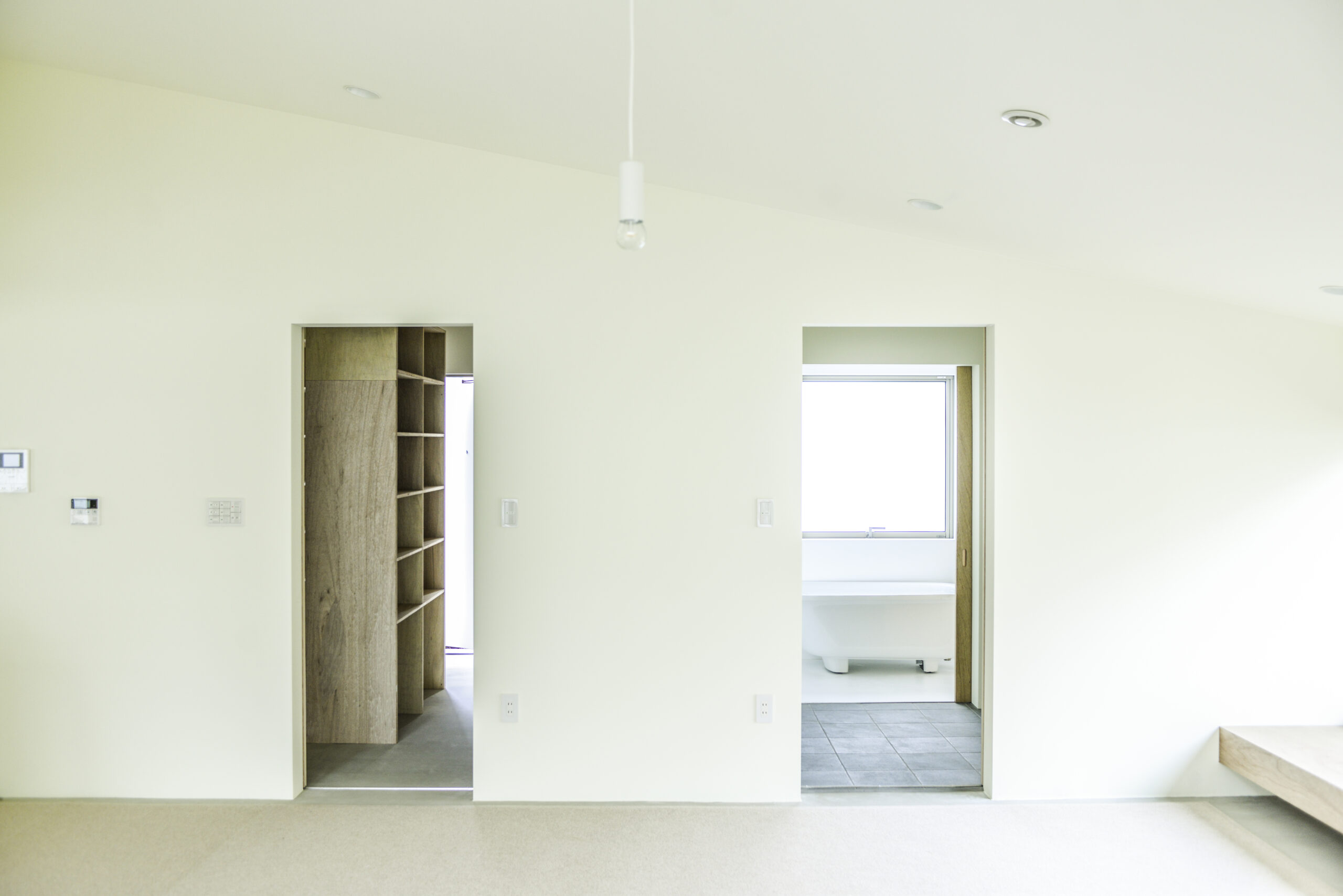 土地が100坪ほどあることと、家族3人に犬が2匹という家族構成であること、また、将来的に脚の弱くなった両親が同居するかもしれないことを考えて、50坪の平屋という構成を提案した。典型的な、6畳の和室に8畳のリビングと部屋を寄せ集めた家とは違った作り方をするために、用途別に必要な大きさのスペースを内外の関係から場所を決めて置いていき、最後に大屋根を掛けて家の形を構成した。内部は配置された部屋と、その間の空間からなるのだが、間の空間は廊下でありリビングでありダイニングであり、家族の共有部分の必要な空間として再発見される。建売住宅の間取り図だけを見て家の良し悪しを判断している人にとっては無駄な空間なのだが、この用途が指定されていないスペースこそ住宅の質を決めるのではないだろうか。なぜなら、人は建物の全体を一時に認知できない。例えば部屋の中では他の部屋が、家の中からは外を同時には認知できない。そのため、廊下や縁側などの移動の空間か、内外が混じった空間が、その建築を全体として認知できる唯一の空間になる。寝食だけの必要条件に含まれない空間だけが、”住む”という全体を捉えられ、住宅を寝食だけの原始的な場所から、住む暮らすという文化的な場所たらしめることができる。だとすると、郊外住宅はいつの間にか暮らす場所ではなく、食べて寝るだけの場所になってしまっていたのではないだろうか。子供部屋は、上部が全てガラス窓になっている。夜は星が、昼間は飛行機が部屋で寝転びながら見ることができる。ワクワクする秘密基地のような空間の入口には扉がなく、また開口部にガラスもはまっていない。施主があまり子供が部屋に閉じこもってほしくないという希望からということもあるのだが、また同時にこのトップライトからの光を周辺の空間へ供給する役割を担っている。扉を閉じてしまえば隣の部屋との連続性や関係性がなくなってしまうばかりか、基本的には部屋同士が互いに何かを供給し合う依存関係にあることはあまりない。しかし、この子供部屋は光による明るさや暖かさをその他の空間にも供給し、開口部はキッチンから和室への視線の抜けも担っている。