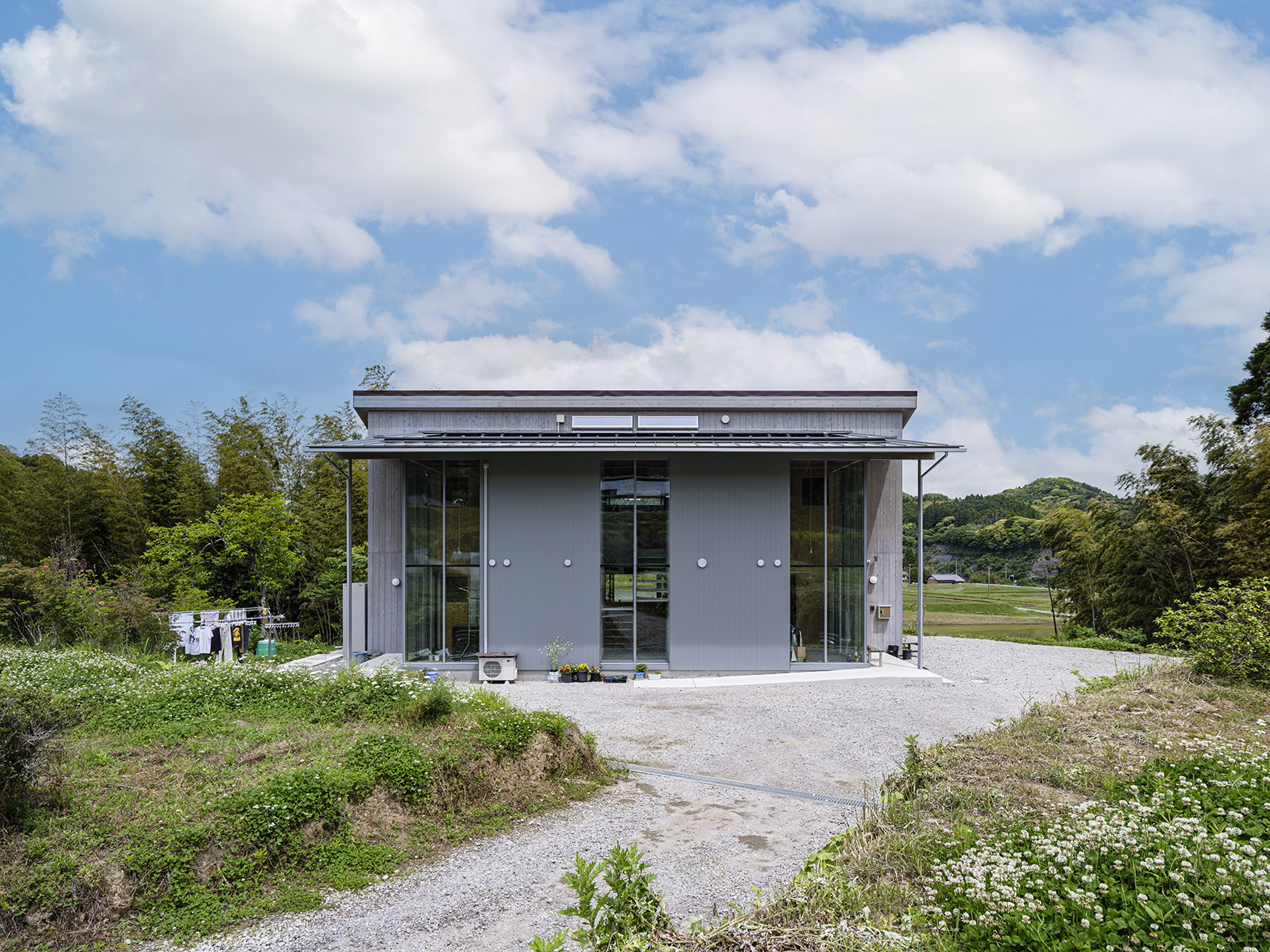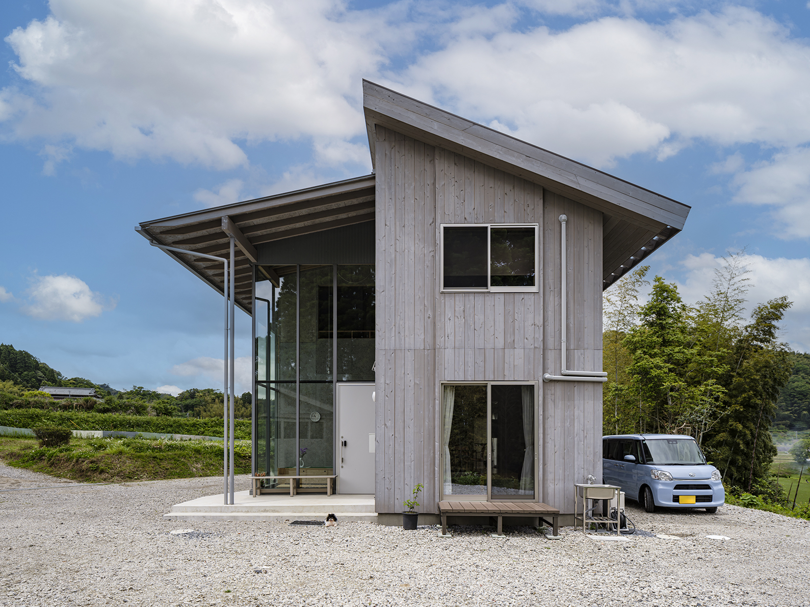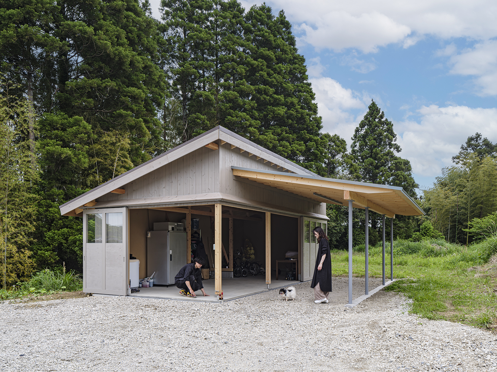 新居と共にご依頼をいただいた倉庫にまで対比的構成は徹底され、似たもの同士の新居と倉庫の並置関係が結果的に農村らしい集落的な佇まいを獲得することになった。結果的に南側アプローチから眺める家の姿は、千葉の山奥には似つかない姿で、田舎でありながらクリエイティブな養蜂をするアンビバレントな家族の姿が暗に表現されている。
