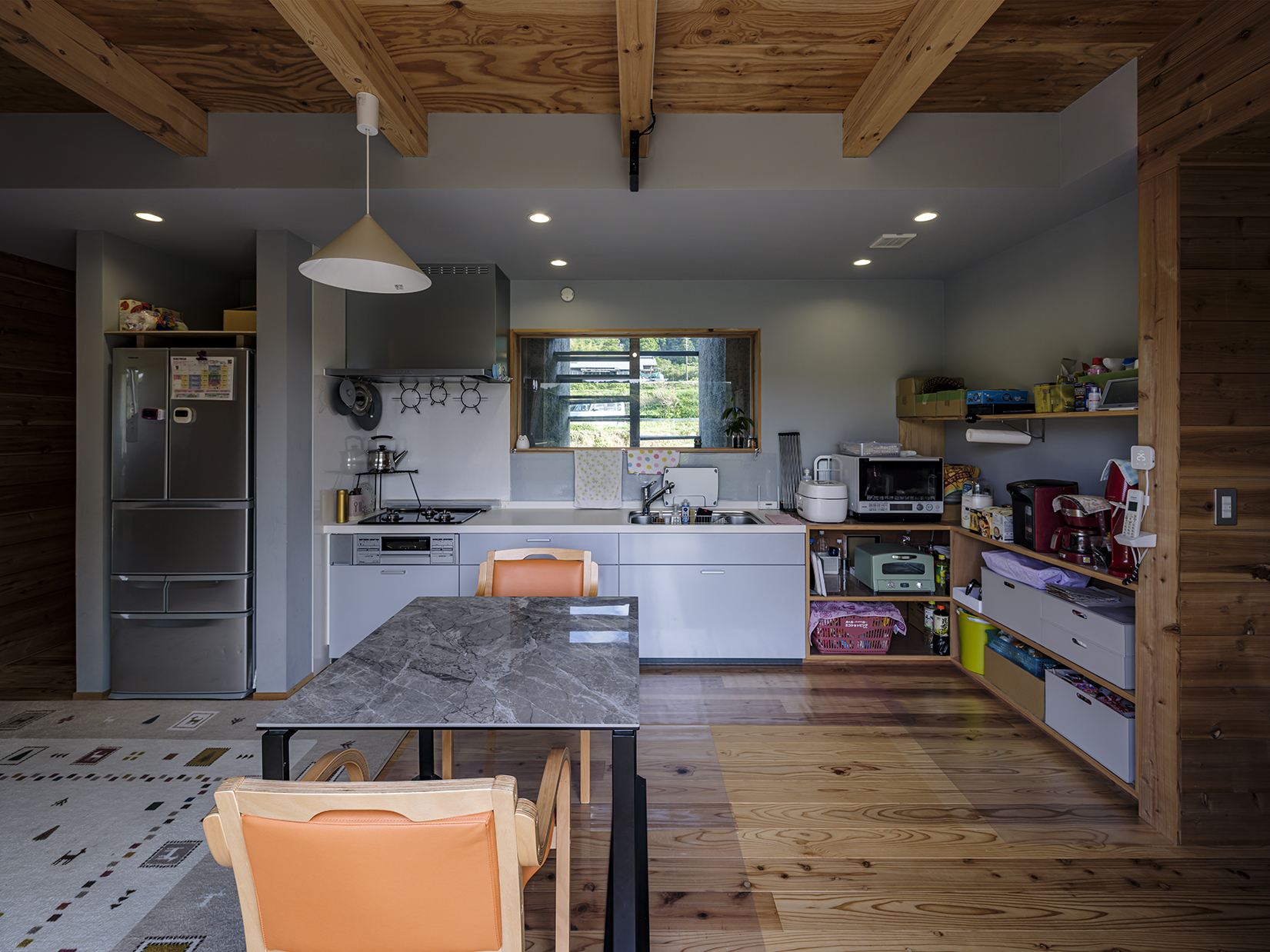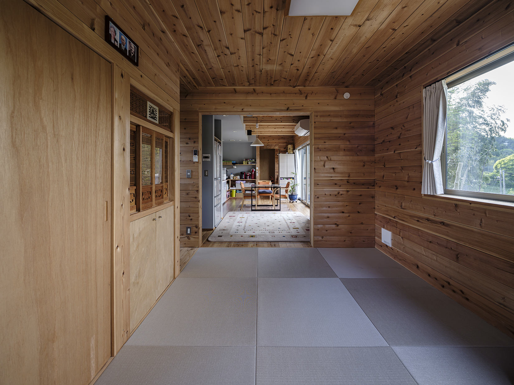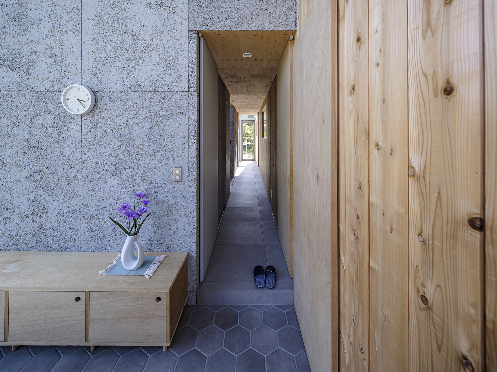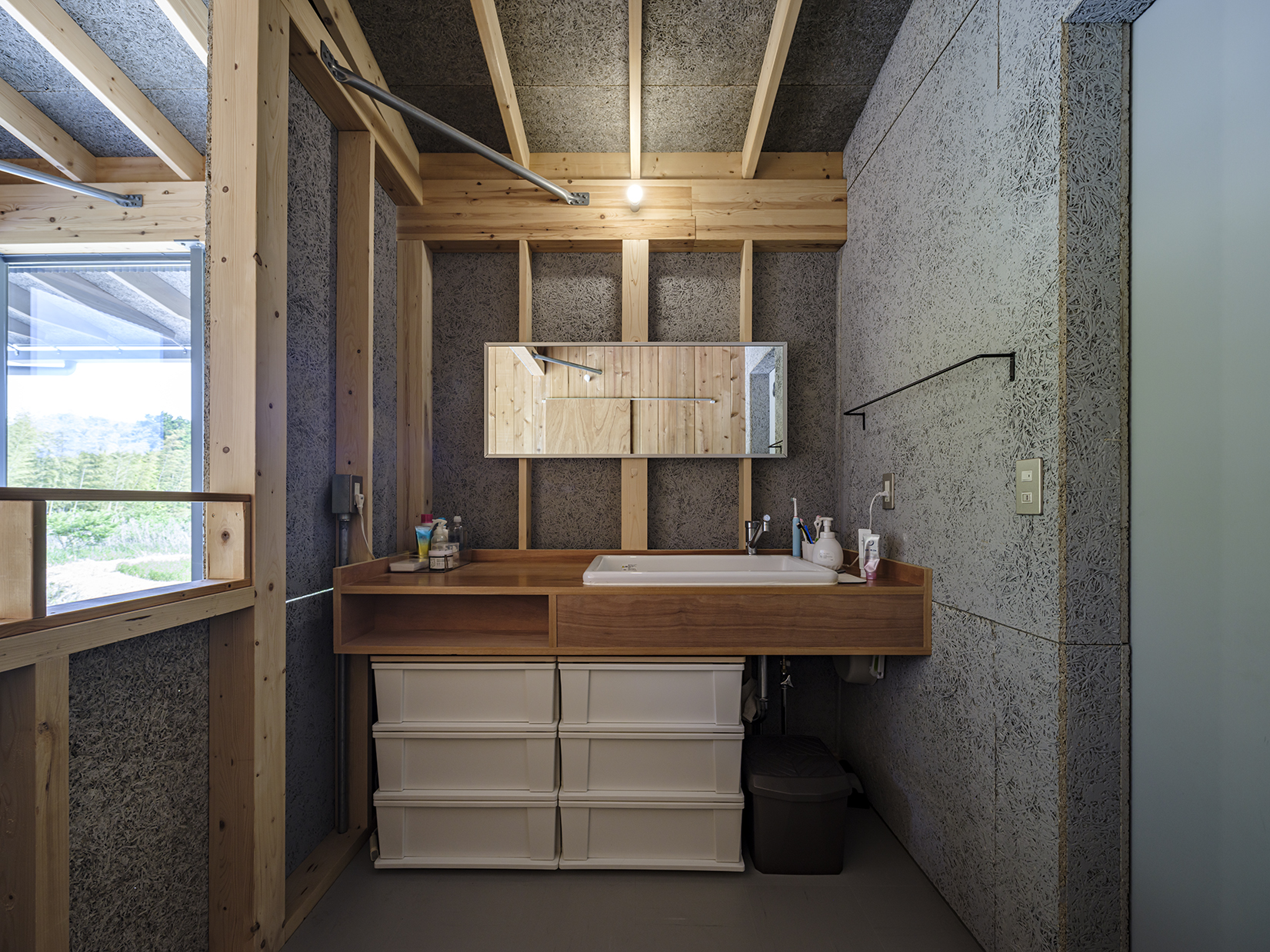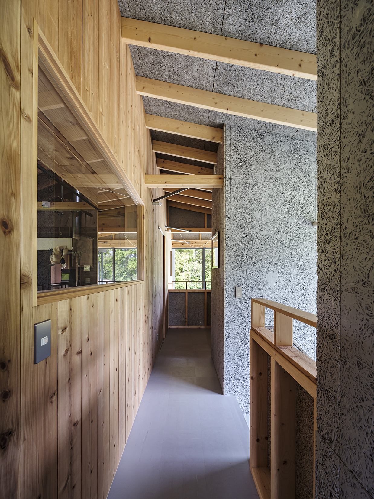 水廻りスペースは造作のスチール方立と単柱によるカーテンウォールで大開口を実現。薄く見せる軒先や、スチール造作の階段など全体に線の細い意匠の空間となっていて、グレーを基調とした素材選択でクールな印象の建物の顔となる設えとした。一方の居住スペースは、内外全てを杉羽目板でくるみ、木の塊に開口を穿つマッスで彫りの深い意匠とした。外部に面した壁には、外張り断熱工法独特の大きな壁厚から生まれる奥行きのある開口と、本来はデットスペースとなる壁内空間を活用した収納やデスクスペースを設えることで、空間を有効に活用しつつ、外部環境からより距離をとることによるセキュアな居住空間を実現している。素材の選択にあたっては、地元の杉材を製材した羽目板を内外の仕上材として活用し、まさに養蜂箱に暮らすような住居が実現した。