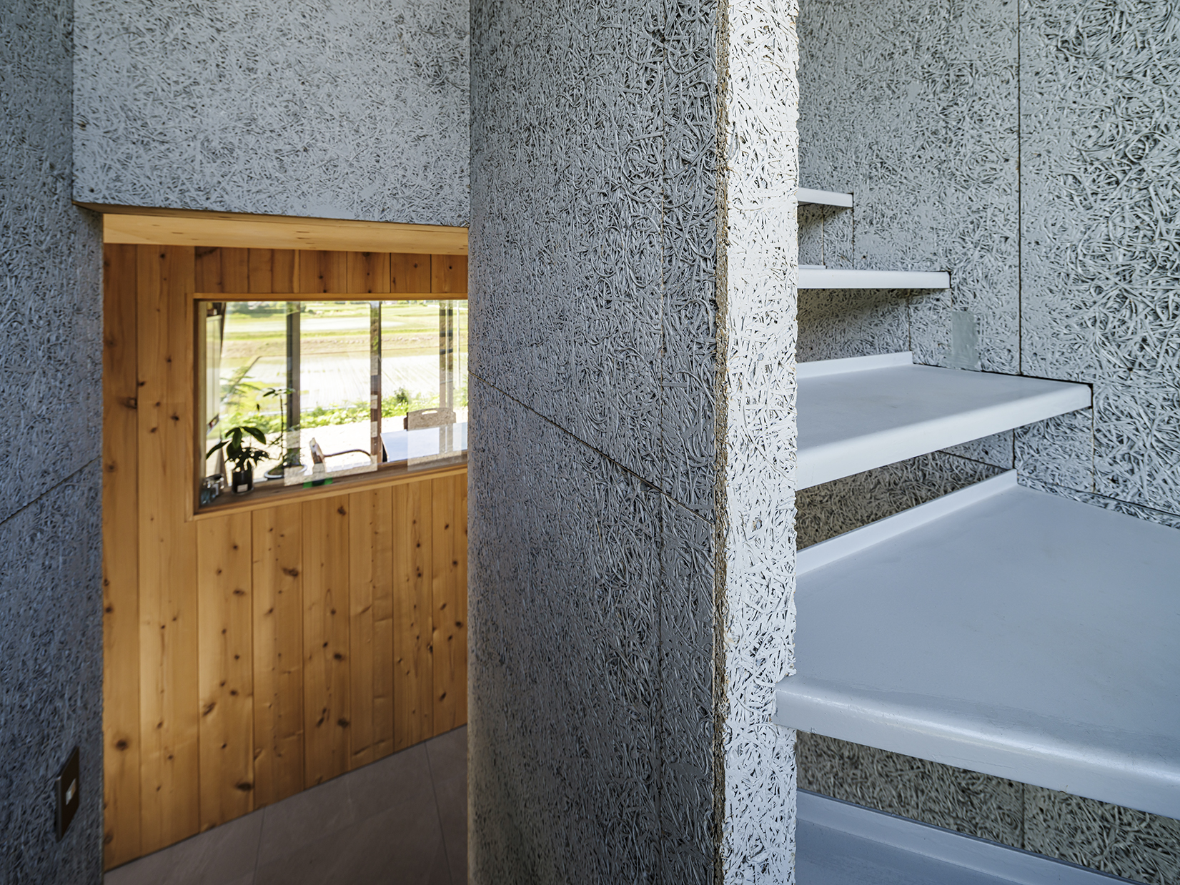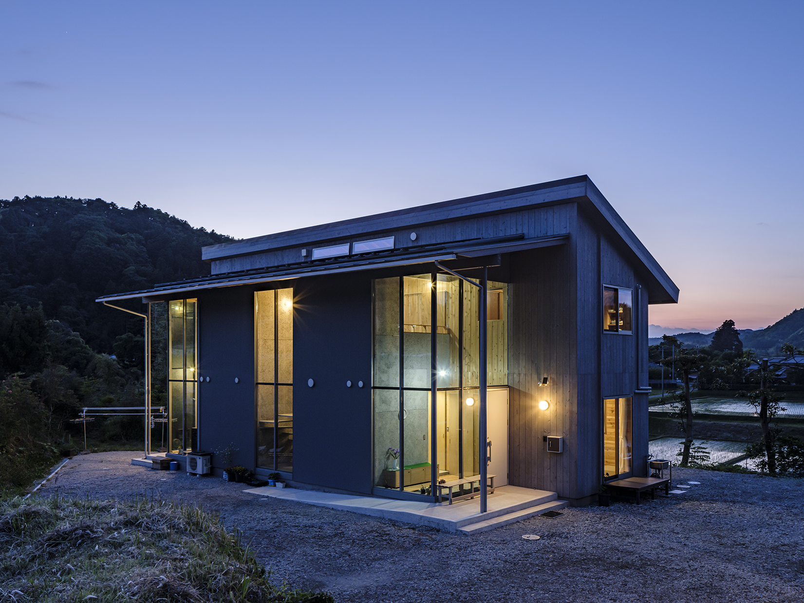 住宅は1階を親世帯、2階を子世帯の住居とし、南側に寄せて大きくカーテンウォールを設けた外光を取り入れる水廻りスペースと、北側に開けた眺望を取り入れつつ開口を絞った居住スペースで構成される。普通であれば北側に寄せて配置される浴室や洗面、トイレなどの水廻りを南側に配置することで、外光に満ちた明るく気持ちよい水廻り空間を作りつつ、この敷地唯一のアプローチとなる南側道路からの視線(とはいっても、集落の最奥に位置し、この家を尋ねる人か田んぼの面倒をみる農家くらいしか人の出入りはないのだが)を遮り、セキュアな居住スペースとの間の、そして上下階で明確に切り分けた2世帯相互の緩衝空間となることを意図した。