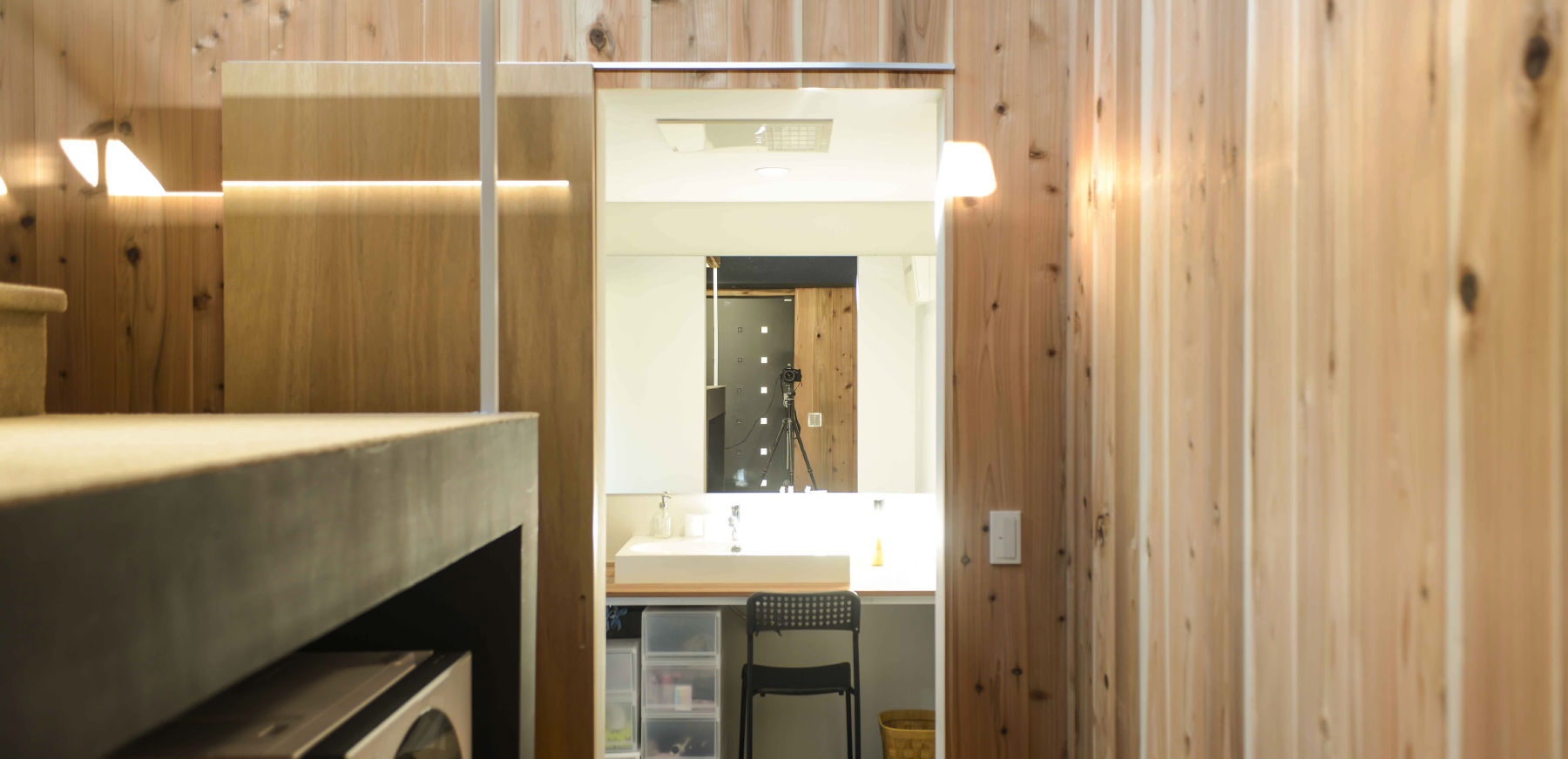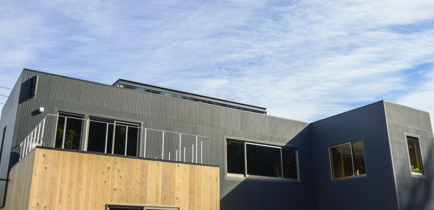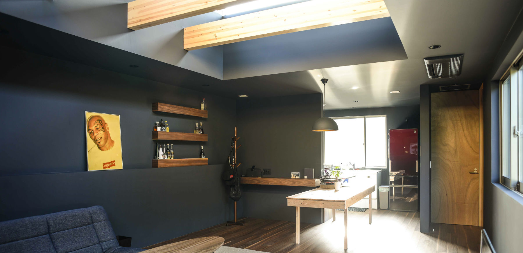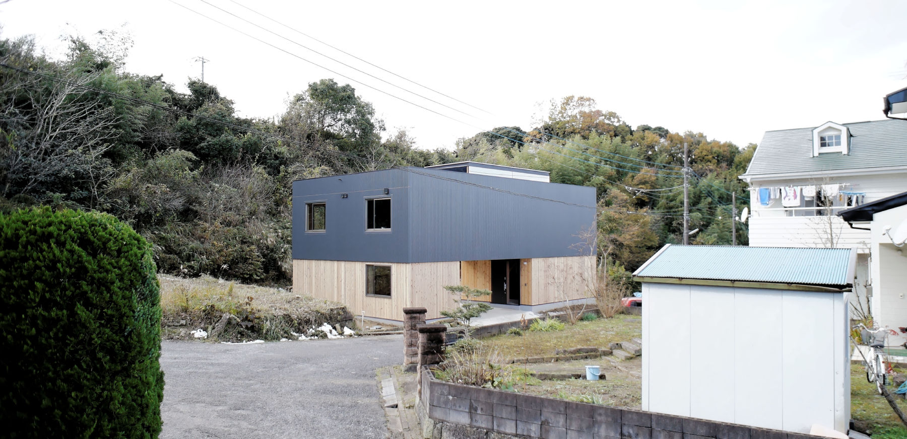 ログハウスに住みたいと希望していた施主だったが、予算と法規の都合で1階部分の内外に杉の羽目板を貼り、2階部分は黒のサイディングと塗装しあげでの切替とした。この住宅でもできる限りフェイクは使用しないように心がけた。多少メンテナンスには労力が必要なのだが、生活の中から家事や家の補修などを取り除いたとして、毎日遊びほうけることが豊かな暮らしだとは考えられないためあえて手がかかるが時間の経過とともに価値が出る素材や風合いの変化を楽しむことができる素材を選択した。