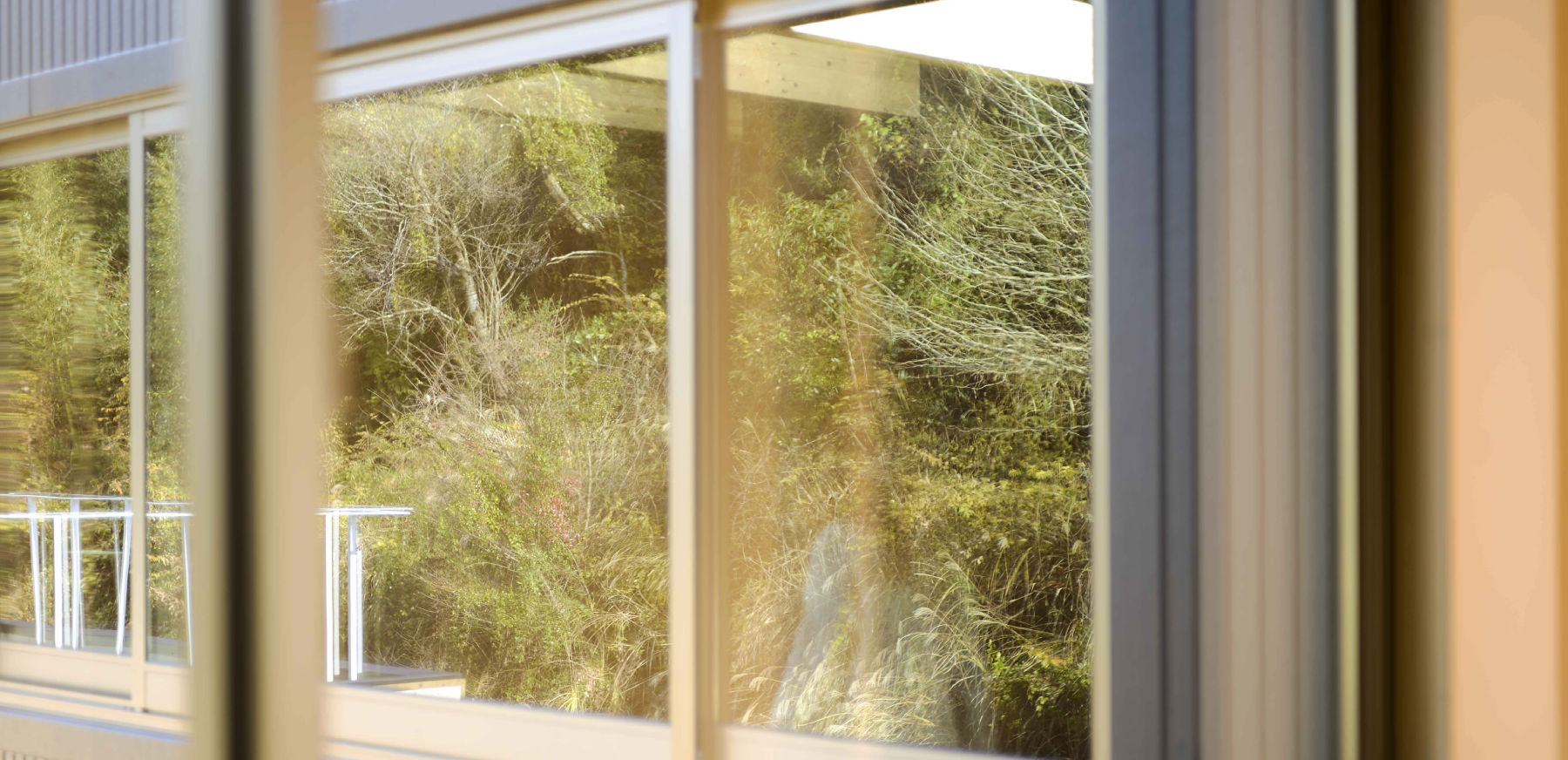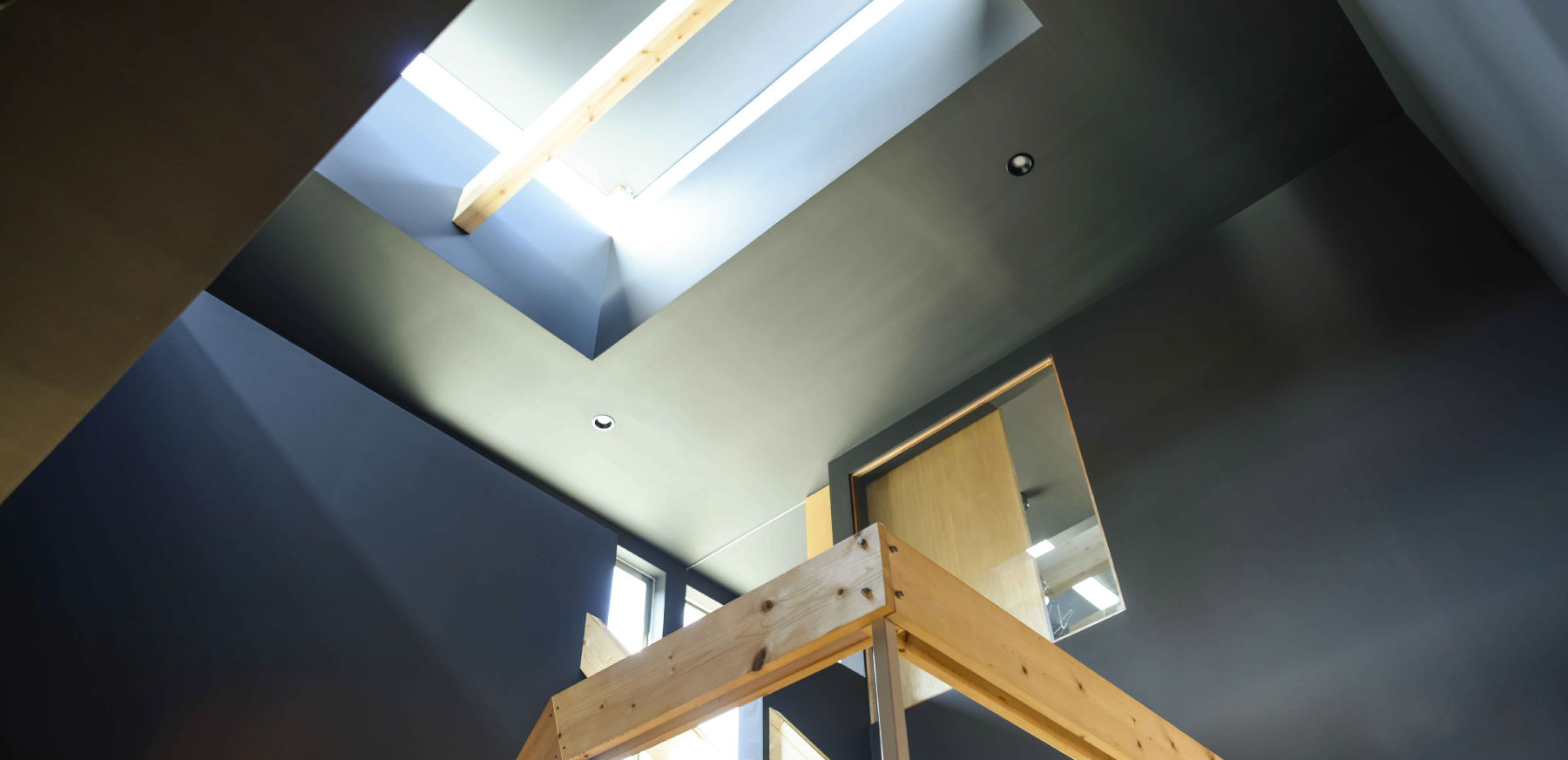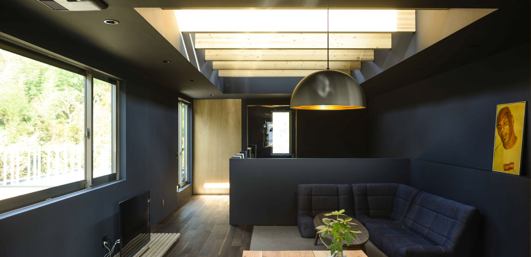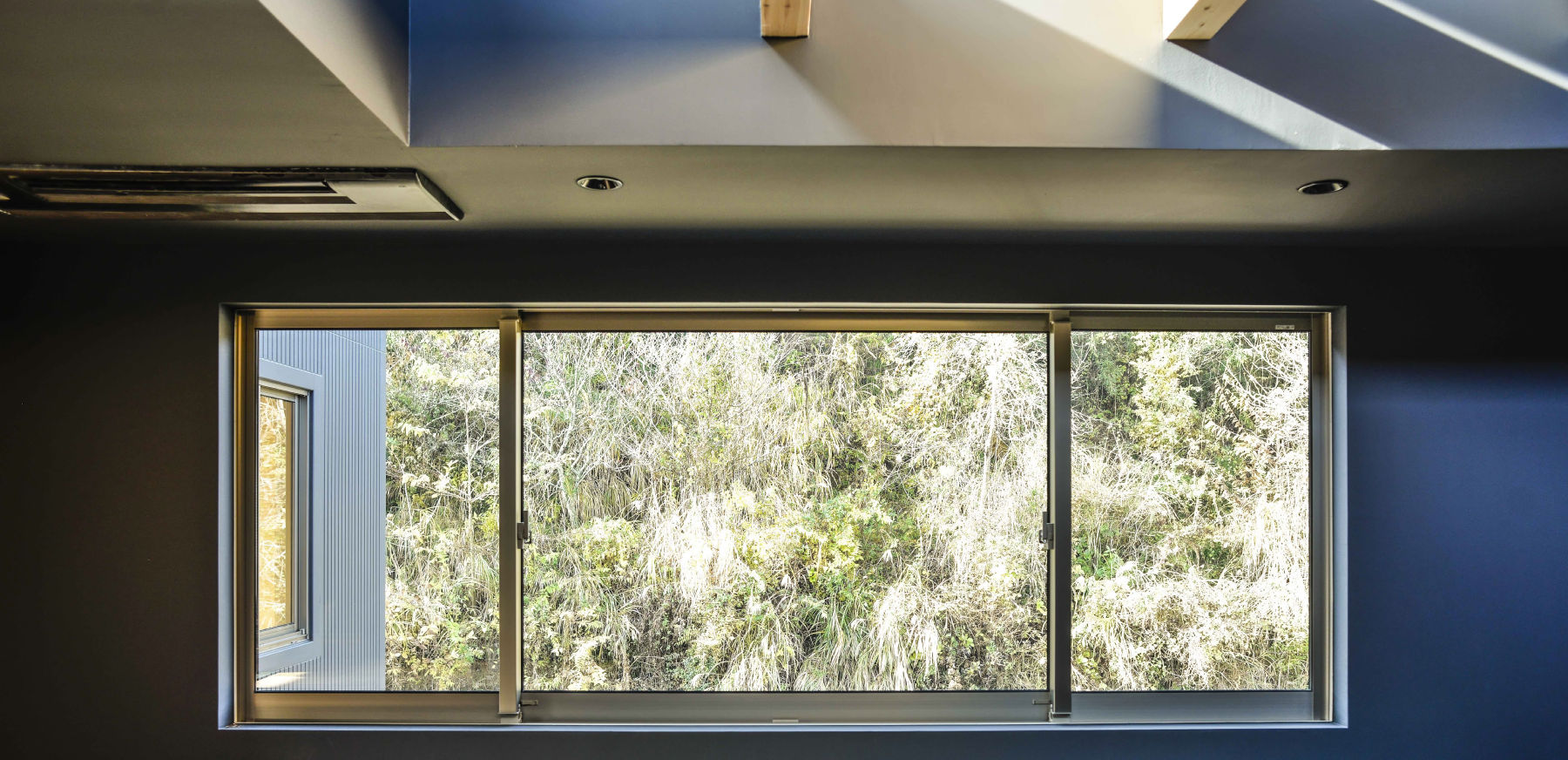 東西に長い構成なのだが、プライバシーをしっかりと確保するために北側に全く開口部を設けていないため採光に不満があった。このためリビング上部の屋根を突き出させて、その四周をハイサイドライトとすることでいつまでも明るく気持ちのよい空間を作ることができた。このハイサイドライトは外壁の外に貼付けるように設置することでガラスの塊のような印象を作って、日が落ちて家の明かりをつけた時に、団地内でランタンの様な印象になるように設えた。