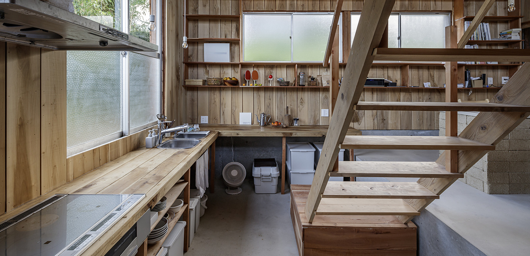 在来木造であるため構造計画も考えやすく、補強もしやすい点から、まずは内部空間を仕切っている雑壁を全て取り払うことにした。すると材料の規格いっぱいで建てられて天井に隠されていた高い小屋組があり、基礎がコンクリートブロックでできている。基礎は打ち直さないといけないが曳家をする予算はないため、上部軸組を保持したまま部分的に基礎を打っていくことにした。この時少し余計に土を掘ることで2層分の空間を確保して、外型をほとんど変えずに周囲へのプレッシャーを極力おさえて、ステップフロアの空間に再構成した。