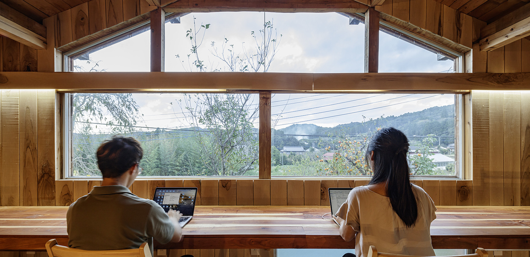 2階レベルの北面に大きな開口部を設けることで、今まで見向きもされていなかった美しい谷間の集落の風景を見ながら仕事ができる事務空間とした。