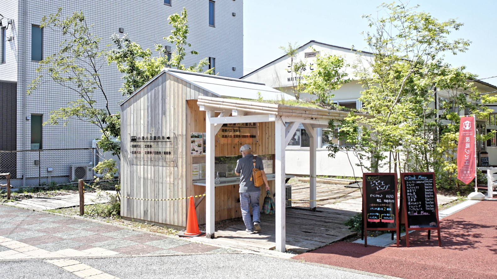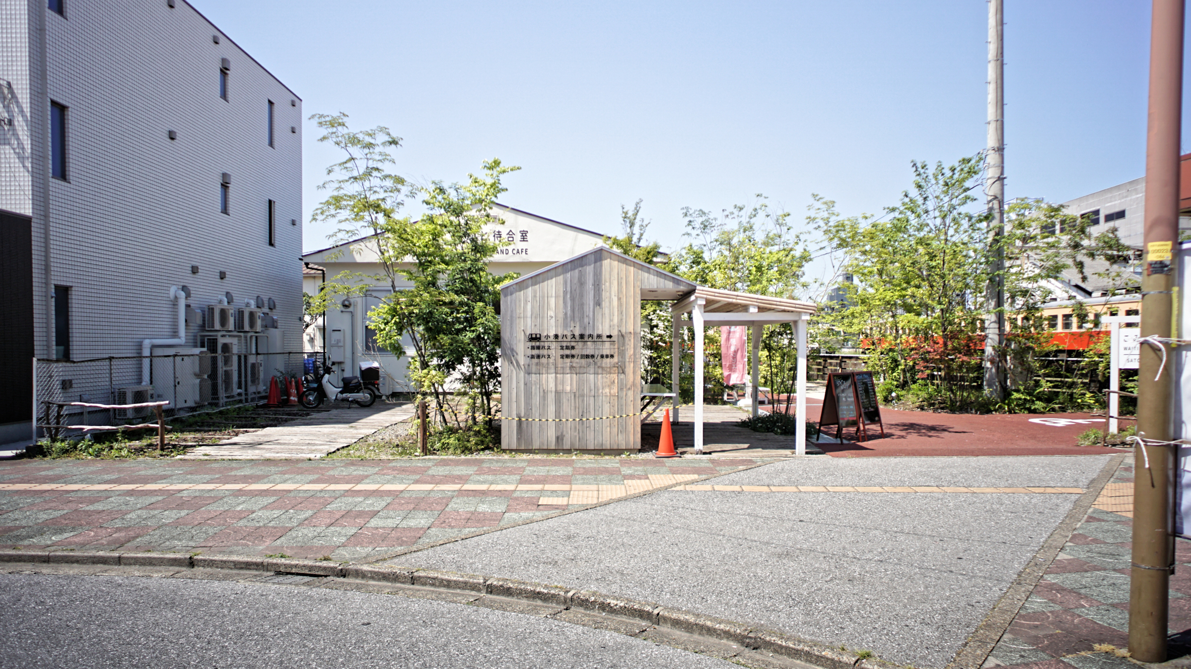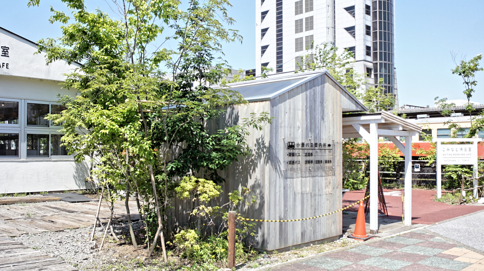 千葉県市原市五井駅前に小湊鐵道のためのバスチケット売り場を設計した。2019年に大型の台風被害に見舞われた小湊鐵道は、沿線が崖崩れや土砂災害などで運休を余儀なくされており、観光鉄道としてのトロッコ列車などが浸透してきていたが、これらの運行にも大きな影響が出ていた。こうした苦境を打開すべく、乗降客の待ち時間の改善やホスピタリティの向上のため、五井駅前にあった古い建物を建て替えて、チケットセンターとカフェを作るプロジェクトを進めるための新しい建物設計が求められた。創業した大正時代から百年近く経た駅舎やその沿線施設群を考えると真新しく四角い箱のような建物はそぐわないと考え、鹿島建設が当時建設した駅舎や倉庫にあるボキャブラリーである羽目板を外壁に用い、建物の形状を貨物上屋と呼ばれる貨物線を引き込んで荷下ろしをするための倉庫から引用することで、歴史ある建物群との調和を試みた。同時に、「逆開発」という小湊鐵道のコンセプトに応えるべく武田屋作庭店がランドスケープをコンクリートから里山に返すように市原市の里山に生えている普通の樹木が植えられることと呼応して、燃料や建材以外の里山の木々の新しい享受の仕方を提案しようと考えた。小さな小屋の屋根半分を天窓としつつ、育った木々がその窓を覆うことによって、都市部のチケットセンターでありながら木漏れ日の中にあるような環境を提供できないかと考えた。これは同時に通常は暗いはずのチケットセンター内が外部よりも明るいという非日常の演出にもなり、観光地である養老渓谷やゴルフ場への期待感を高められるのではないかと考えた。カフェの計画は後のコロナ禍での混乱によって新築をせずに既存倉庫が地場工務店の手によってリノベーションされた。後に武田屋作庭店によってパーゴラが追加されるなど、設計者の意図を離れて木々と共に変化し続けている。
