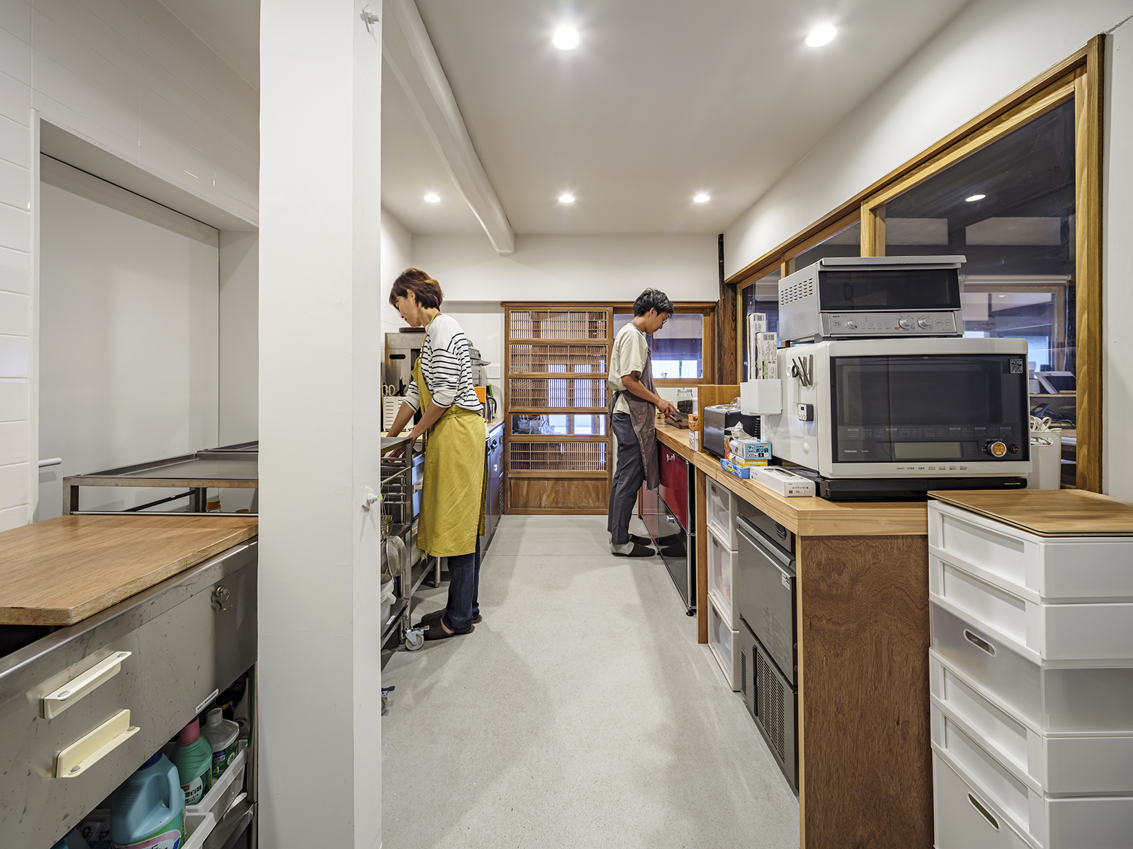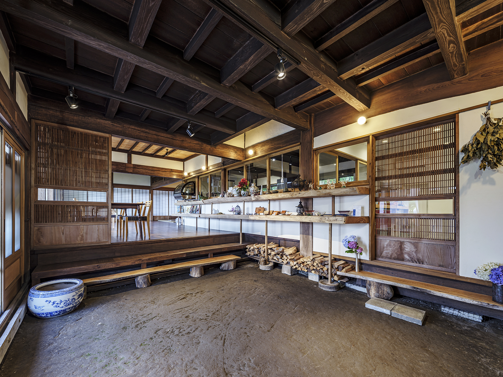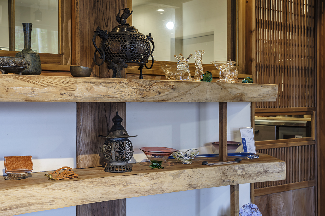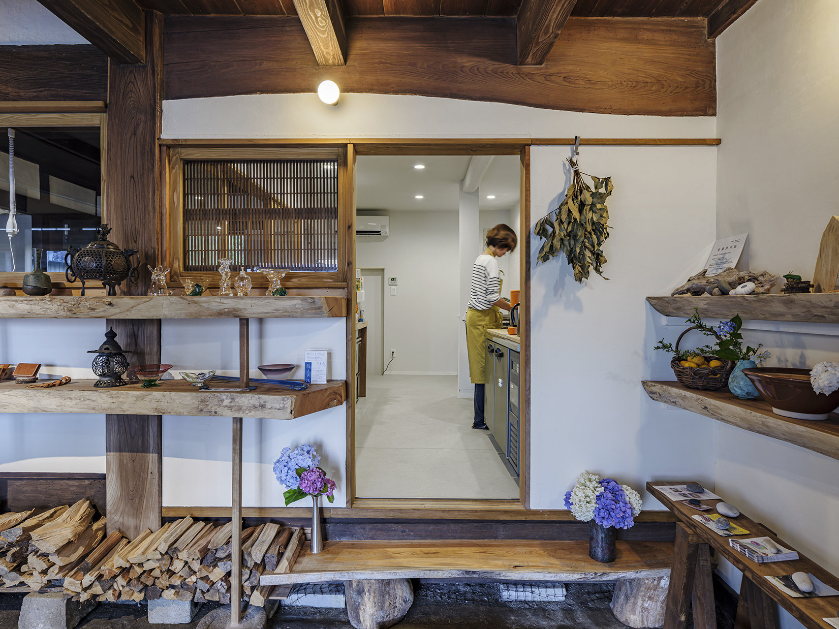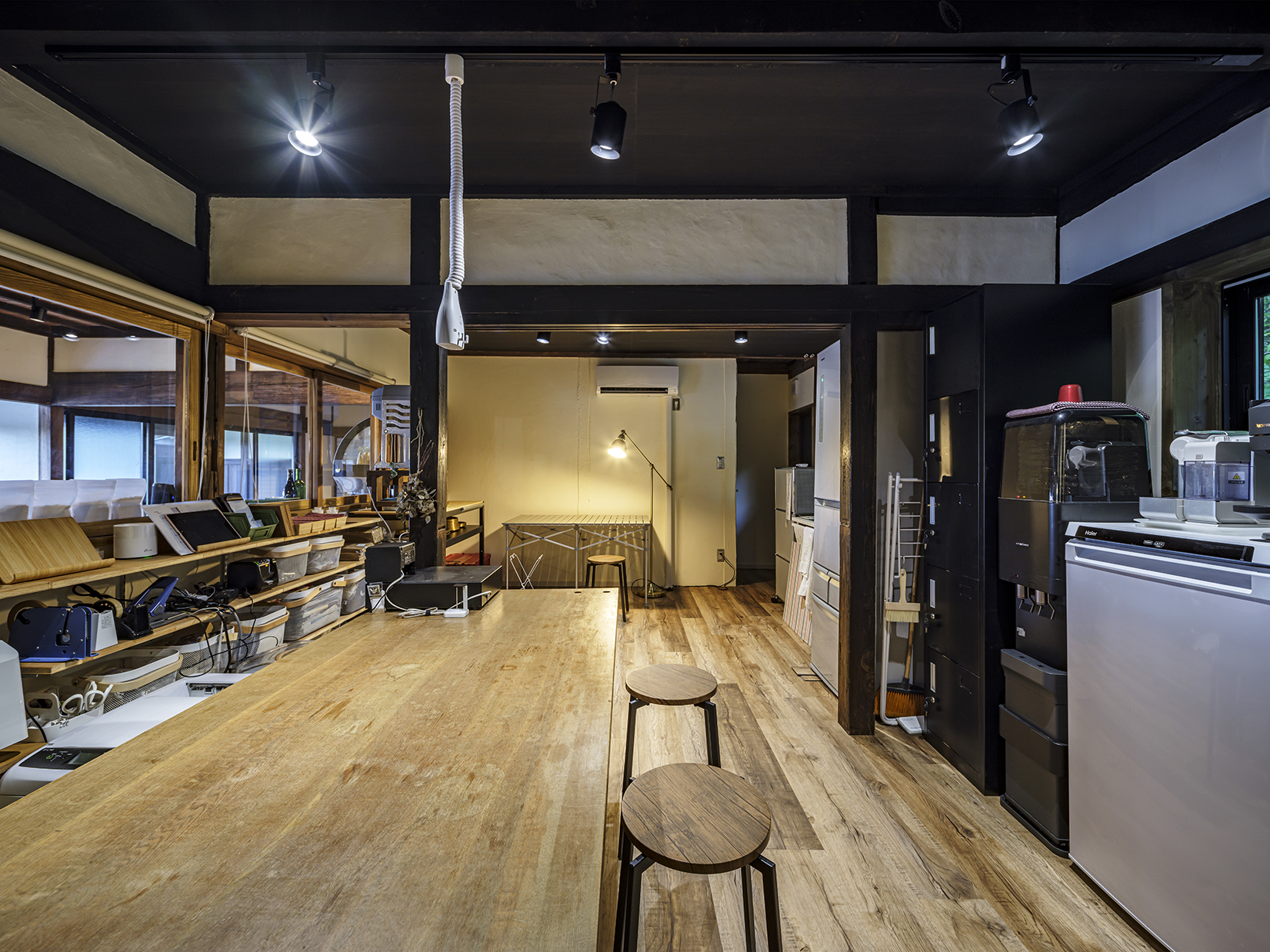 エントランスを入って一番初めに見えるアイキャッチとなる厨房作業室のファサードには、シェアスペース利用者と来訪客の接点を最大化させるべく、連続する水平窓とカウンター兼陳列棚による境界を計画した。施設の一番の顔となるカウンター兼陳列棚には、施主が以前伐採して製材しておいたケヤキの一枚板を使用することで、存在感のある什器が実現した。また、もともと古民家にあった施主お気に入りの古建具を新たな引戸に、臼をカウンターの束石に転用したり、施主が知人から譲り受けた照明器具を提供してもらって活用するなど、古民家と施主の繋がりから導かれる素材やアイテム、ディテールを都度施主と話し合いながら決定した。