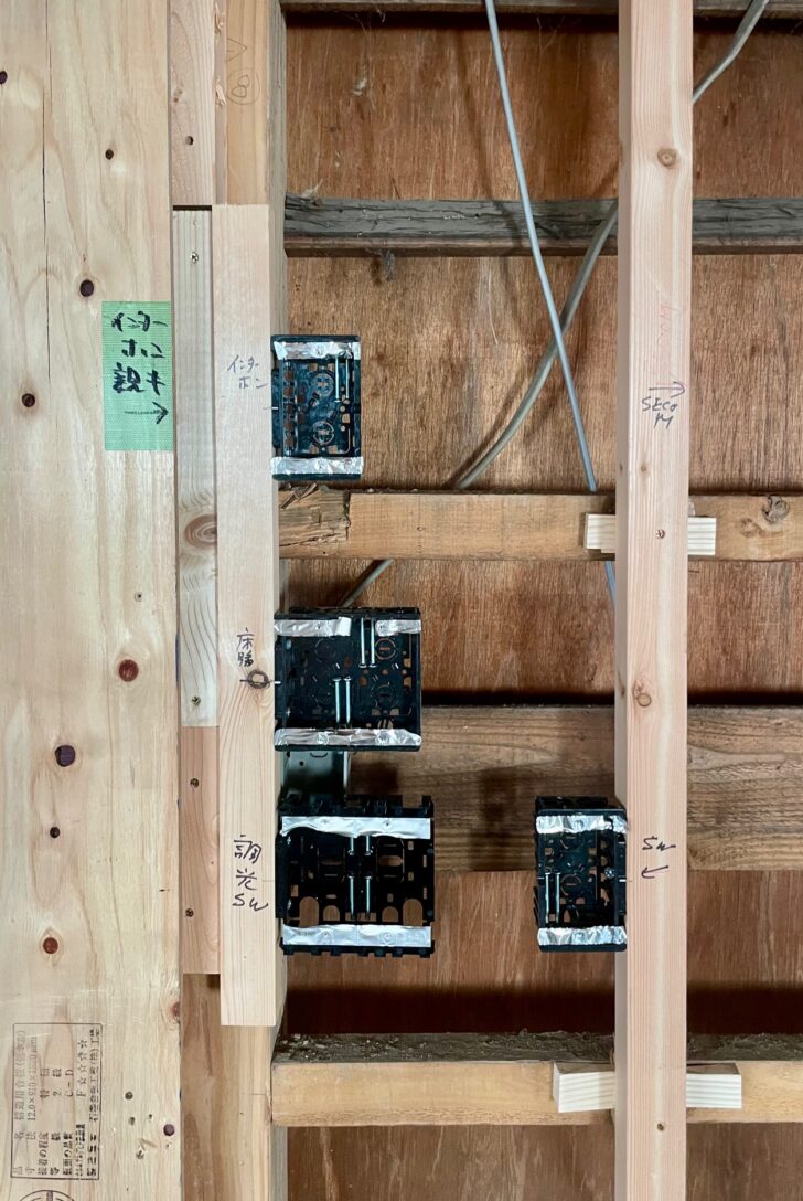 大工による下地づくりがひと段落し、電気配線の工事がスタートした。電気や給排水設備の配線配管は人体で言うところの血管や神経に例えられることがあるが、まさしく下地や断熱材といった建物の骨格、表皮と呼べるものの隙間を縫うように線が張り巡らされていく。リノベーションとなるとそこに既存配線、既存構造物との絡みも出てきて、都度イレギュラーに対応するために現場での打ち合わせが欠かせない。時に電気屋さんと共に頭を悩ませながら、迷路を解くかのごとくルートを見つけ出す。こうしたところにすべてをアンダーコントロールできないリノベーション特有の難しさがあり、一方で職人とともに悩み作り上げる楽しさも見出している。