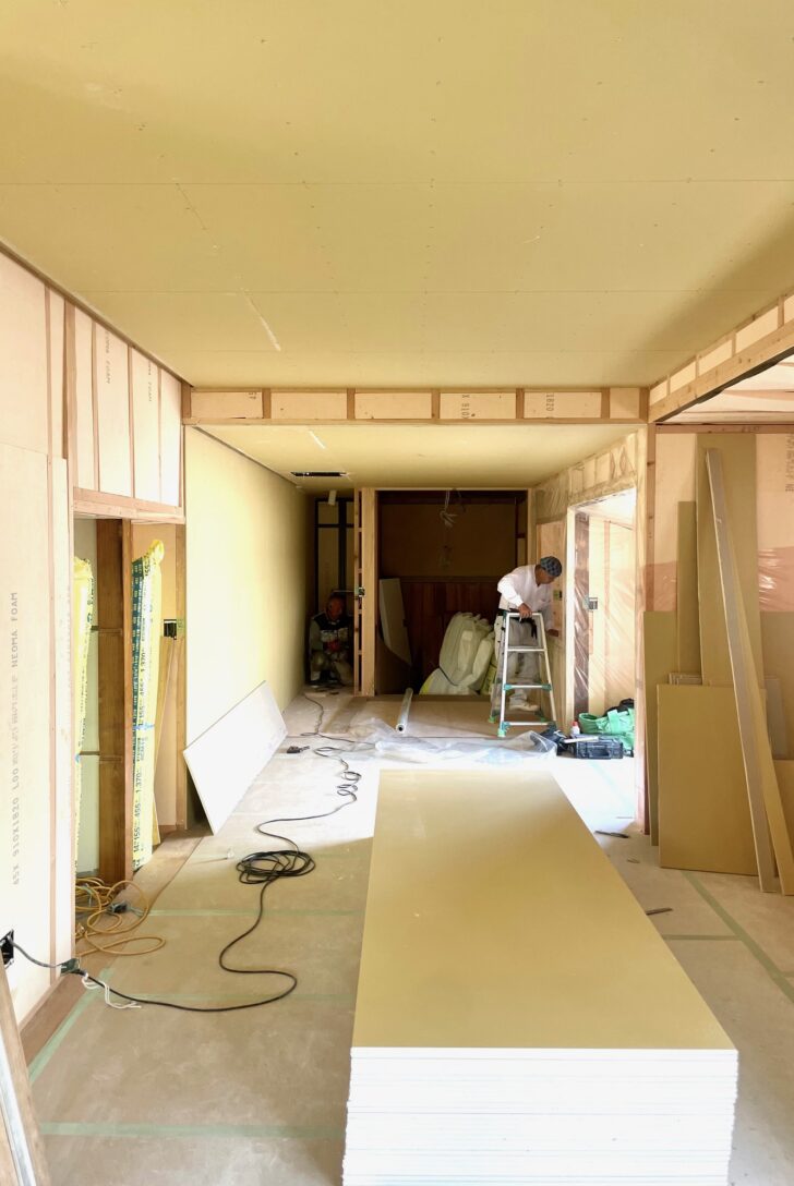 古民家リノベーションの内装工事が進んでいる。白基調のフラットな内装、高性能のサッシ、折り上げ天井に間接照明。古民家なのにマンションライクを求めるお施主さんの要望に応えた“逆張り”の家になっている。壁は厚さ6mmのケイカル板にクロスを貼り込んだパネルを制作し、それを接着して仕上げる仕様で、開口部も特注のスチール枠を制作してもらい、枠の存在感を消す納まりになっている。パネル工法やスチール枠はそもそもオフィスや商業施設などの非住宅用途で、同一規格の既製品を用いて早くきれいに仕上げるための納め方であり、古民家の、ましてやリノベーション工事で採用することは普通はないだろう。お施主さんの逆張り精神に答えた、古民家らしからぬクリーンでミニマルな内装に仕上がる予定だ。