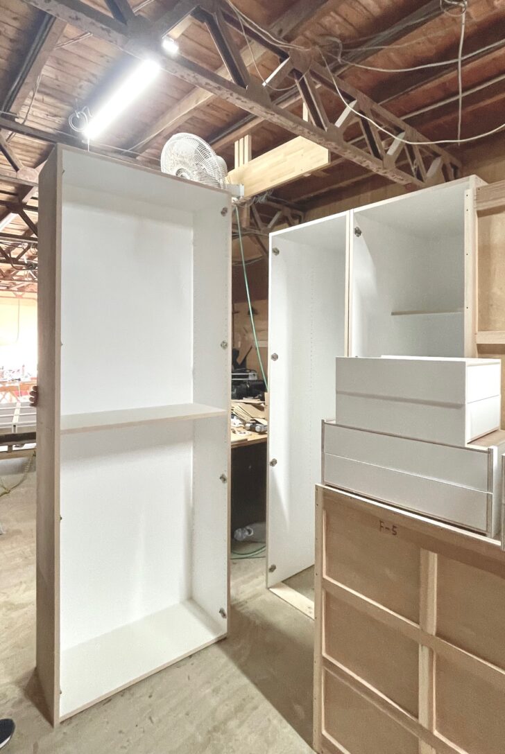 このプロジェクトの造作家具のほとんどは、藤江木工所さんに製作をお願いしている。古民家のリノベーションといえば既存躯体の歪み撓みに対応するため、家具の造作も現場合わせでの製作となることが多いが、今回のプロジェクトでは既存躯体の歪みを拾わないよう縁を切ったふかし壁による内装としているため、新築工事同様にプレファブの家具をインストールする工法が可能となった。一部家具が出来上がってきたとのことで、製品検査に伺った。大型の工作機器を駆使し、熟練の職人さんによって組み上げられた家具は、非常に高い精度で製作されている。現場製作では到底実現できない仕上がりで、お施主さんのイメージする“マンションライクな”内装が実現する予定だ。