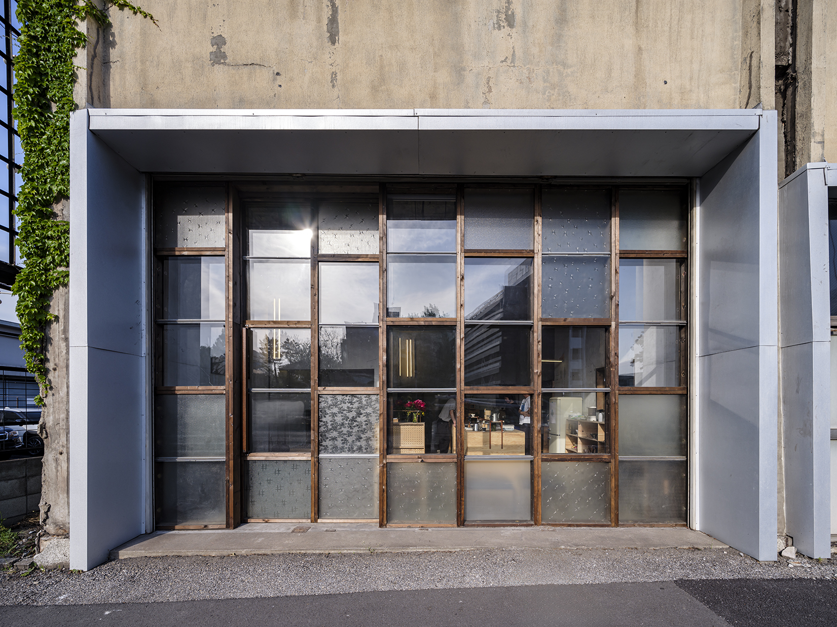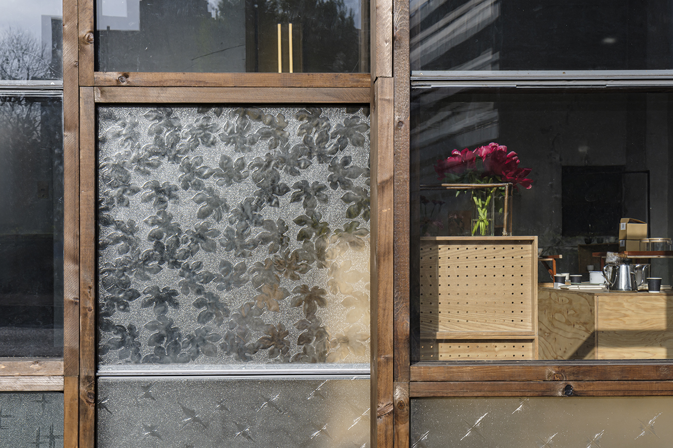 限られた予算という制約と、多くの人とかかわりながら共にコーヒーに向き合うワークショップスタイルの店舗であるという特性から、ショップフロントのカーテンウォールについても多くの部分を施主やその友人知人による施工とするDITでプロジェクトを進めていくことが決まった。材料についても、プレカット工場から出る2m程度のSPF材の端材と、解体された住宅からでた産廃になってしまうアルミサッシの山からガラスを取り外して活用することで、タダ同然の金額で調達した。