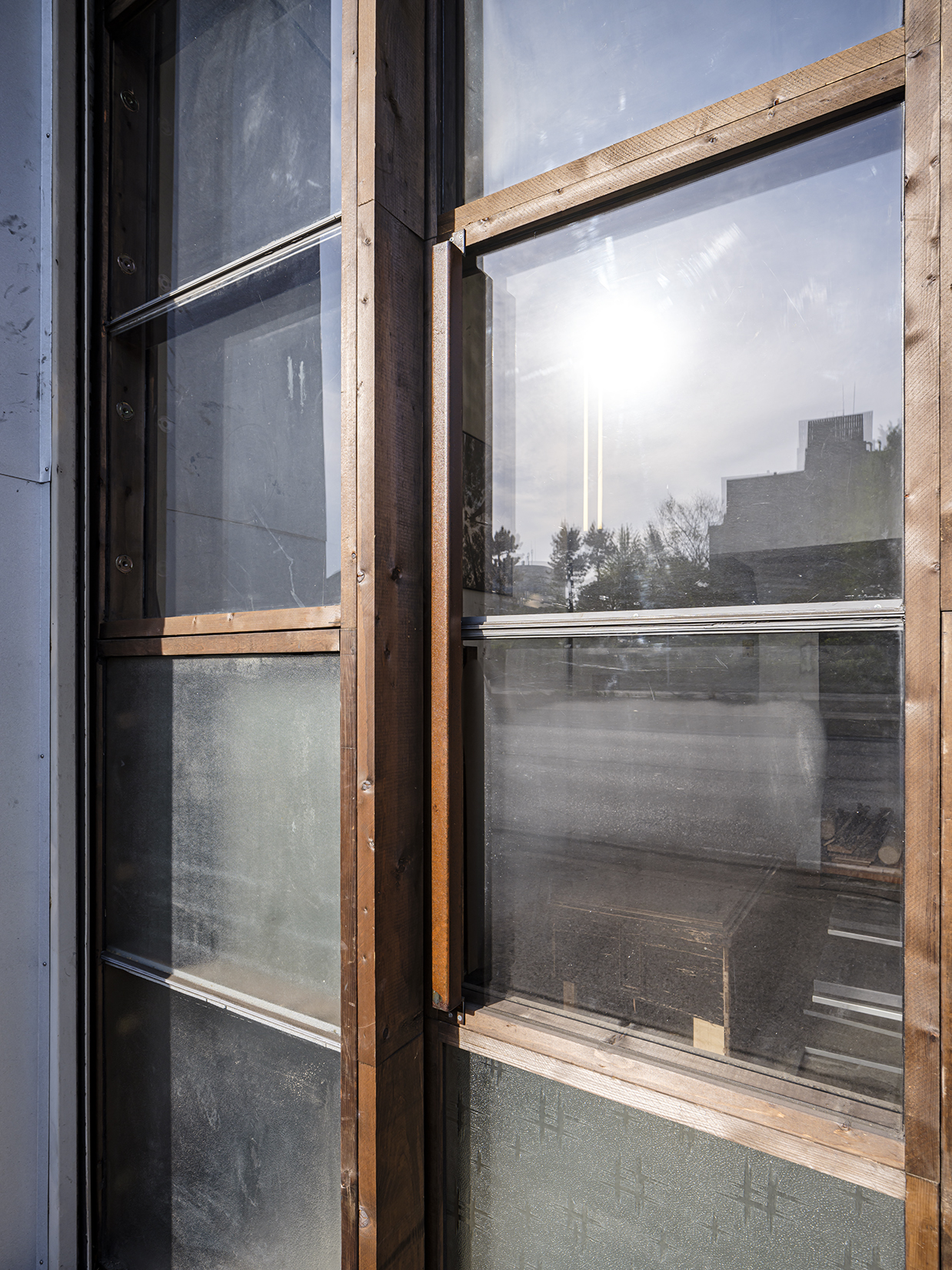施主による施工ということと、手に入る部材寸法の制約から、1400mm×800mmと700mm×800mm程度で組んだSPF材のフレームに溝を突きガラスをはめ込んだ2パターンのユニットを事前に制作し、それらを現場で互い違いに積み重ね、相互に固定することでカーテンウォールとしての強度を確保した。透明ガラス・型ガラス・すりガラスが混在する大量の廃材ガラスをフレームごとに使い分けダブルスキンとすることで、国道からの視線と音、熱を制御している。