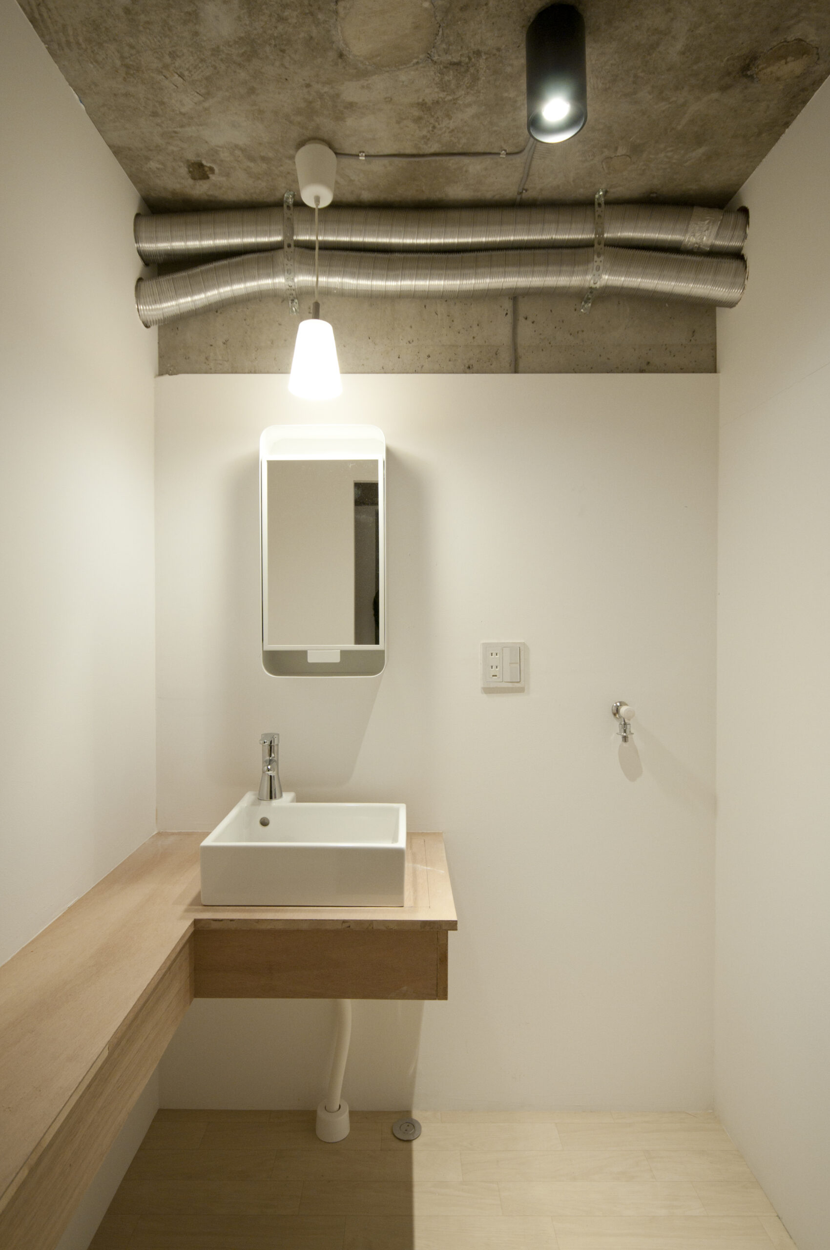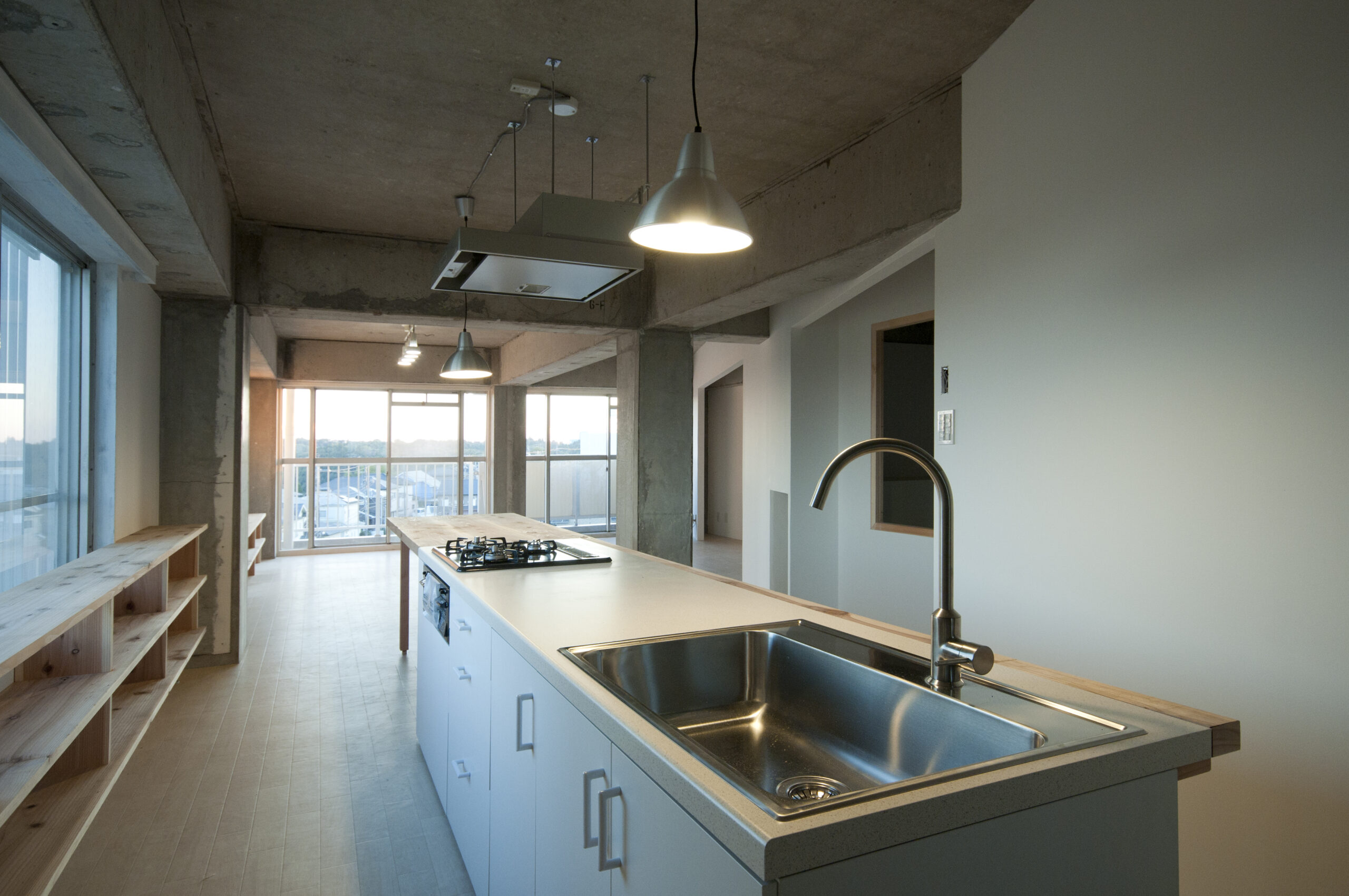 新しく家族になった夫婦とその子供のためのリノベーションで、新婚夫婦と親子という二重の状況をもつ家族が、一つの家族になれる空間を作りたいと考えた。そのために、家族で過ごすスペースを最大に、プライベートなスペースを最小にすることとした。マンションの一室の限られたスペースの中で、最大の空間を作るために、最長の長さの壁を対角線に作ることとした。ベランダに面した気持ちの良い側を家族のためのLDKとして設え、残りの半分を水廻りと寝室とした。夫婦寝室と子供部屋、またそれぞれの部屋とLDKの間には廊下があり、小さな緩衝空間として家族の距離感を作り出す手助けになるように期待した。